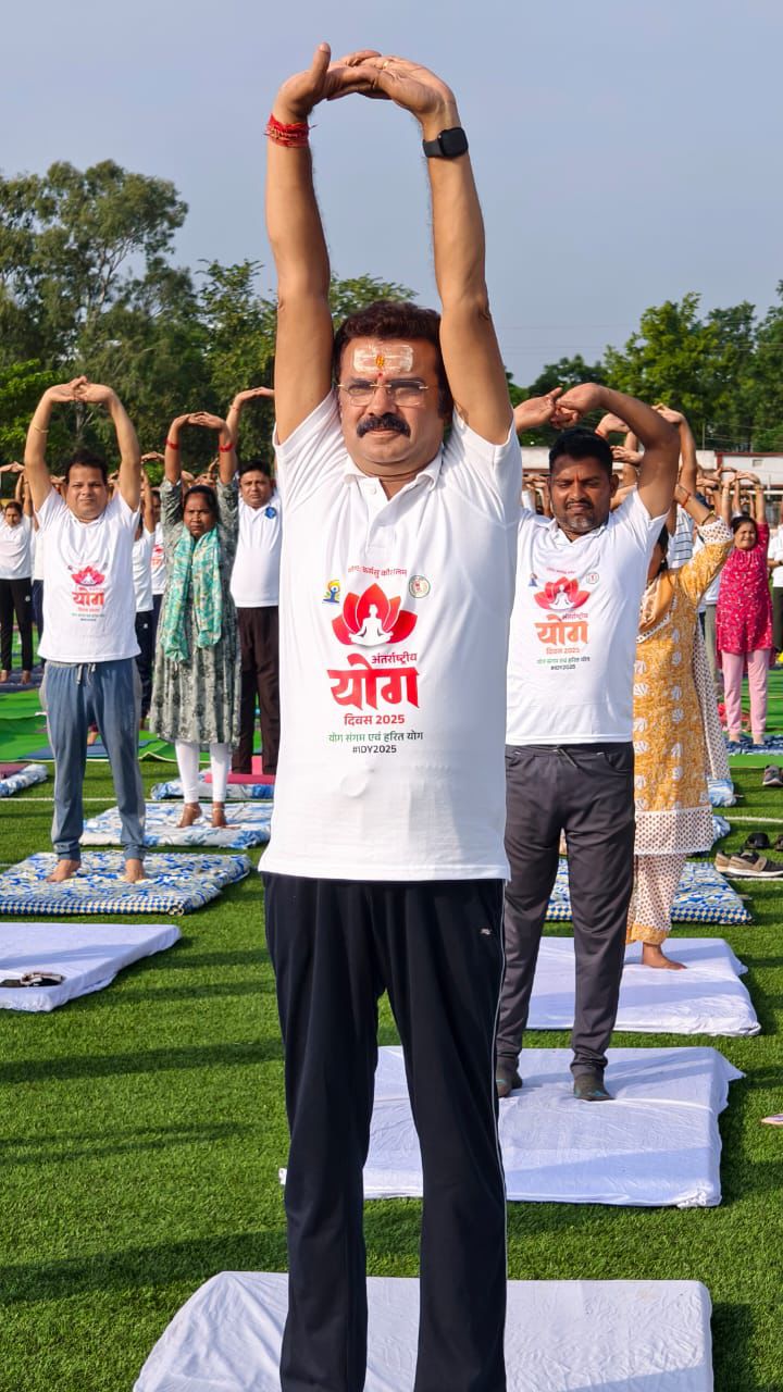 जगदलपुर। ग्यारहवाँ अंतरराष्ट्रीय योग दिवस ‘एक पृथ्वी, एक स्वास्थ्य के लिए योग ’ योग संगम और हरित योग थीम पर सामूहिक योग कार्यक्रम शहर के इंदिरा प्रियदर्शनी स्टेडियम में किया गया। योगाभ्यास कार्यक्रम में मुख्य अतिथि भाजपा प्रदेश अध्यक्ष एवं जगदलपुर विधायक किरण देव शामिल हुए। इस अवसर पर श्री किरण देव ने कहा कि करें योग-रहें निरोग इसी भावना के साथ स्वस्थ शरीर के लिए नियमित योग आसनों का अभ्यास करें। भारत वर्ष की पुरातन विधा योग को अंतर्राष्ट्रीय स्तर पर स्वास्थ्य के क्षेत्र में विशेष कसरत के रूप में पहचान मिली है। आज पूरे विश्व सहित प्रदेश के सभी जगहों पर योगाभ्यास किया जा रहा है।इस दौरान विधायक श्री देव ने एक पेड़ माँ के नाम के तहत स्टेडियम परिसर में पौधरोपण भी किया ।