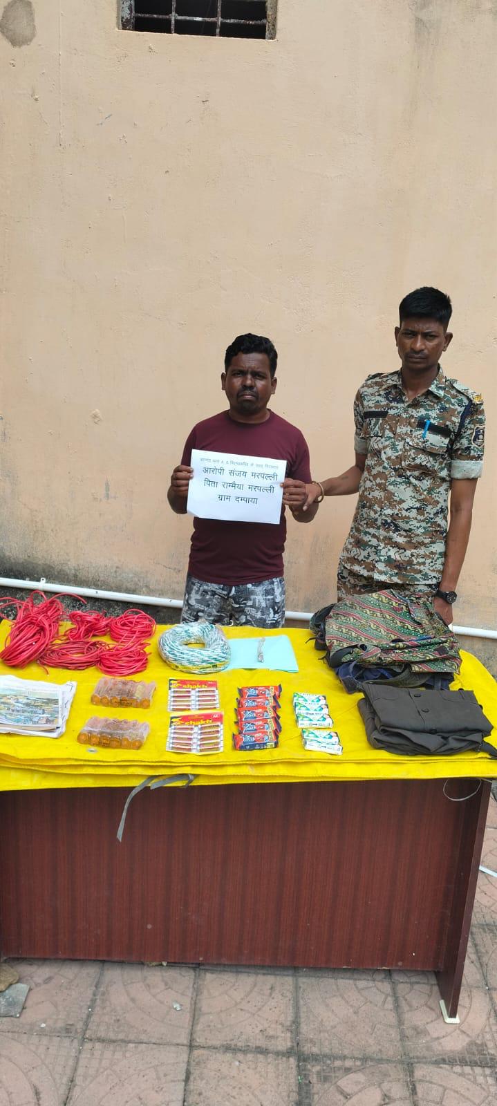 मद्देड़ थाना क्षेत्र में विस्फोटक सहित एक नलसल सहयोगी पकड़ा गया है। उसके पास से विस्फोटक, माओवादी वर्दी, पिटठू, माओवादी साहित्य एवं दैनिक उपयोग की सामग्री बरामद की गई है। डीआरजी बीजापुर एवं थाना गंगालूर की संयुक्त कार्यवाही में गश्त सर्चिंग दौरान मुतवेंडी से विस्फोटक सामग्री के साथ 3 माओवादी गिरफ़्तार किए गए। इसी तरह थाना जांगला की कार्रवाई में छोटेतुमनार रास्ते से एक माओवादी सदस्य को विस्फोटक सामग्री के साथ पकड़ा गया। नक्सल विरोधी अभियान के तहत थाना मद्देड़ की कार्यवाही में दुधेड़ा एवं दम्पाया के मध्य जंगल से माओवादी सहयोगी संजय मरपल्ली को विस्फोटक सामग्री, माओवादी वर्दी, पिटठू एवं अन्य दैनिक उपयोग की सामग्री के साथ पकड़ा गया।डीआरजी बीजापुर और थाना गंगालूर की टीम गश्त सर्चिंग पर पीड़िया- मुतवेंडी की ओर निकली थी। अभियान के दौरान मुतवेंडी के पास जंगल से 3 संदिग्ध को विस्फोटक के साथ पकड़ा गया। कमलू ऊर्फ कलमू (मिलिशिया सदस्य), कोसा भोगाम (मिलिशिया सदस्य,कोसा तामो (मिलिशिया सदस्य)।