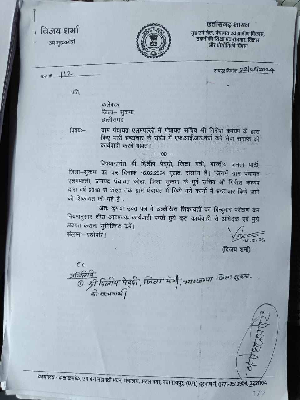 ज्ञातव्य हो कि सुकमा जिले के एक भाजपा नेता ने कांग्रेस के कार्यकाल में एलमपल्ली पंचायत में हुए भ्रष्टाचार मामले में की जांच दोबारा कराने की मांग करते हुए 16 फरवरी 2024 को उप मुख्यमंत्री विजय शर्मा को पत्र लिखा था। उक्त मामले की जांच में एक करोड़ से अधिक राशि की अफरा तफरी का खुलासा हो चुका था। संगठन के नेता से मिली शिकायत को गंभीरता से लेते हुए उपमुख्यमंत्री श्री शर्मा ने एलमपल्ली सचिव गिरीश कश्यप के खिलाफ एफआईआर दर्ज करा कर उसकी सेवा समाप्ति के निर्देश कलेक्टर सुकमा को दिए थे। इस निर्देश पत्र में श्री शर्मा ने 12 बिंदुओं पर जांच कराने के लिए भी कहा था। मगर एक वर्ष बाद भी मंत्री के आदेशों का पालन नहीं हो सका है।