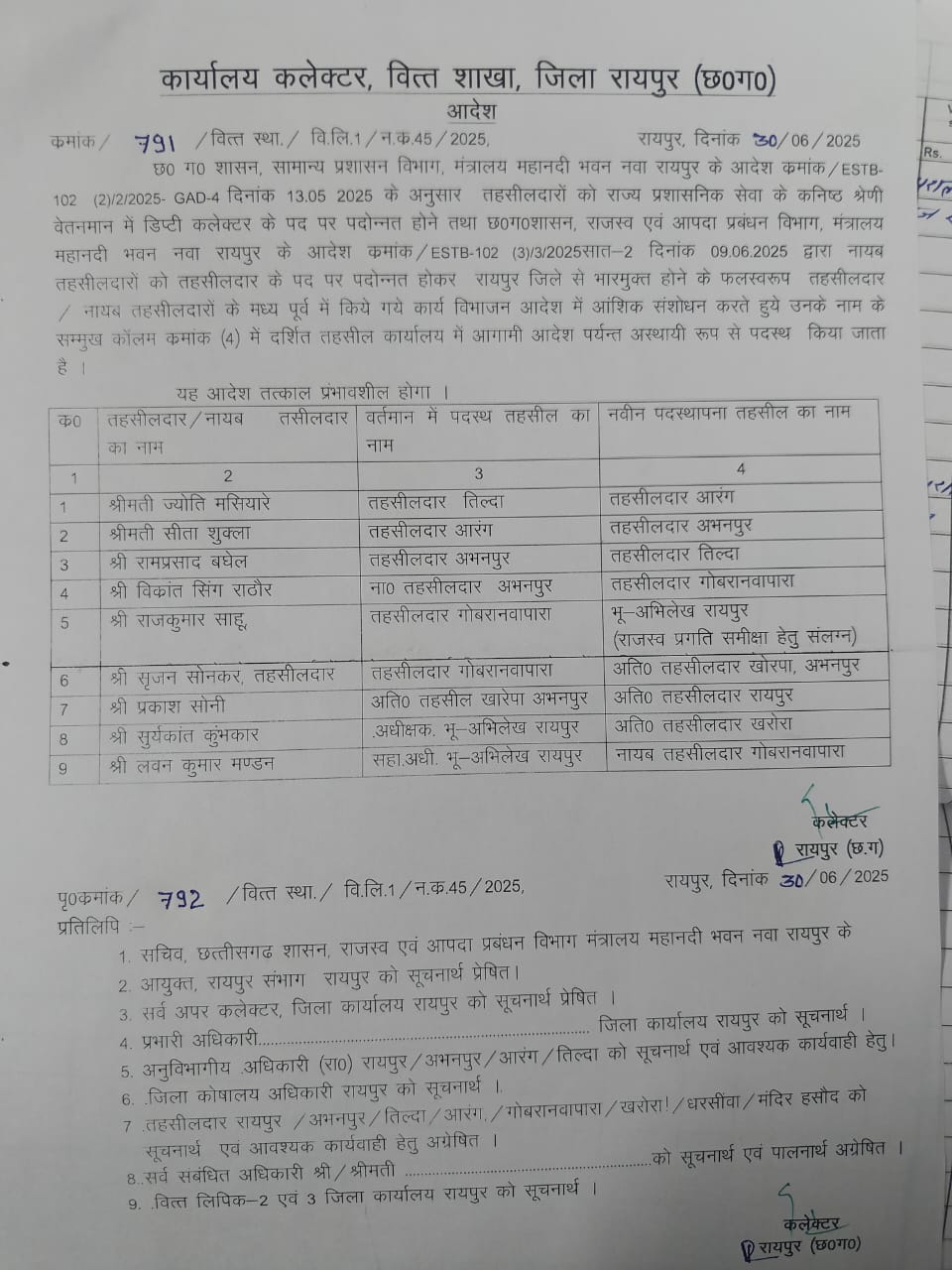 रायपुर। राजधानी रायपुर और जिले में पदस्थ 9 तहसीलदारों का प्रशासनिक फेरबदल किया गया है। रायपुर कलेक्टर ने सोमवार को इस संबंध में स्थानांतरण आदेश जारी किए।