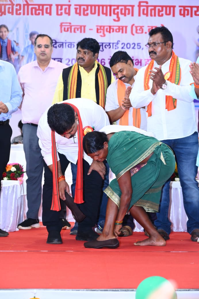 जगदलपुर। प्रदेश के उप मुख्यमंत्री एवं गृहमंत्री विजय शर्मा ने आज सुकमा जिले के प्रवास के दौरान जिला मुख्यालय में आयोजित शाला प्रवेश उत्सव और तेंदूपत्ता संग्रहकों को चरण पादुका वितरण कार्यक्रम में एक महिला तेंदूपत्ता श्रमिक को अपने हाथों से जूतियां पहनाई। उन्होंने जिले भर से आए स्कूली बच्चों से आत्मीय संवाद किया और उन्हें शिक्षा की नई शुरुआत के लिए शुभकामनाएं दीं।