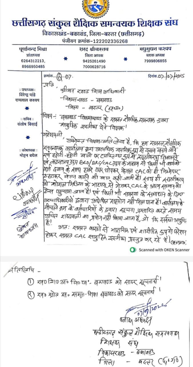 शैक्षणिक समन्वयक कार्यालय द्वारा मानसिक रूप से दबाव बनाया जाता है एवं छोटी छोटी बातों पर व्यक्तिगत रूप से स्पष्टीकरण मांगा जाता है। वाट्सएप के माध्यम से बीईओ, बीआरसी, सीएसी ग्रुप में किसी भी कार्य लिए दबाव बनाया जाता है और सीएसी का काम है बोलकर वेतन काटने रोकने की धमकी दी जाती है सोशल मीडिया के माध्यम से स्पष्टीकरण भेजकर सीएसी के आत्मसम्मान ठेस पहुंचाया जा रहा है और समस्या का समाधान के लिए उच्च अधिकारी द्वारा अपेक्षित सहयोग नहीं किया जाता है। कार्यालय के छोटे कर्मचारियों के जरिए सूचना प्रस्तारित करते समय अभद्र व्यवहार और अमर्यादित शब्दों का प्रयोग किया जाता है। सभी शैक्षणिक समन्वयक शारीरिक एवं मानसिक रूप से परेशान हो चले हैं। अंततः ब्लॉक के सभी शैक्षणिक समन्वयकों ने सामूहिक इस्तीफा दे दिया।