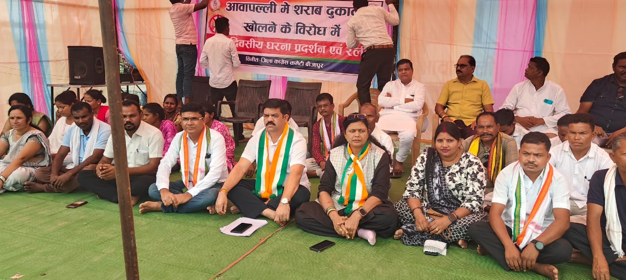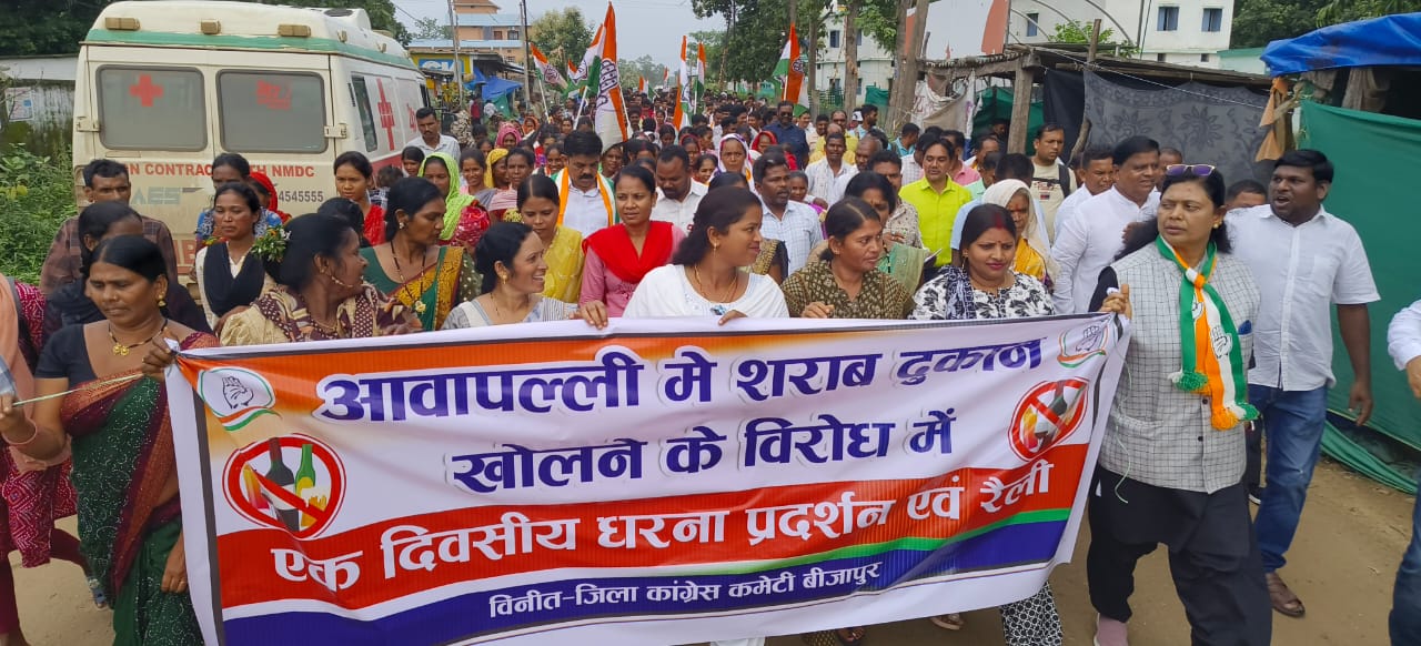 जगदलपुर। घोर नक्सल प्रभावित आवापल्ली में देशी विदेशी शराब दुकान खोले जाने के विरोध में आज जिला कांग्रेस कमेटी बीजापुर द्वारा धरना प्रदर्शन एवं रैली कर शराब दुकान को तुरंत बंद करने की मांग की गई।