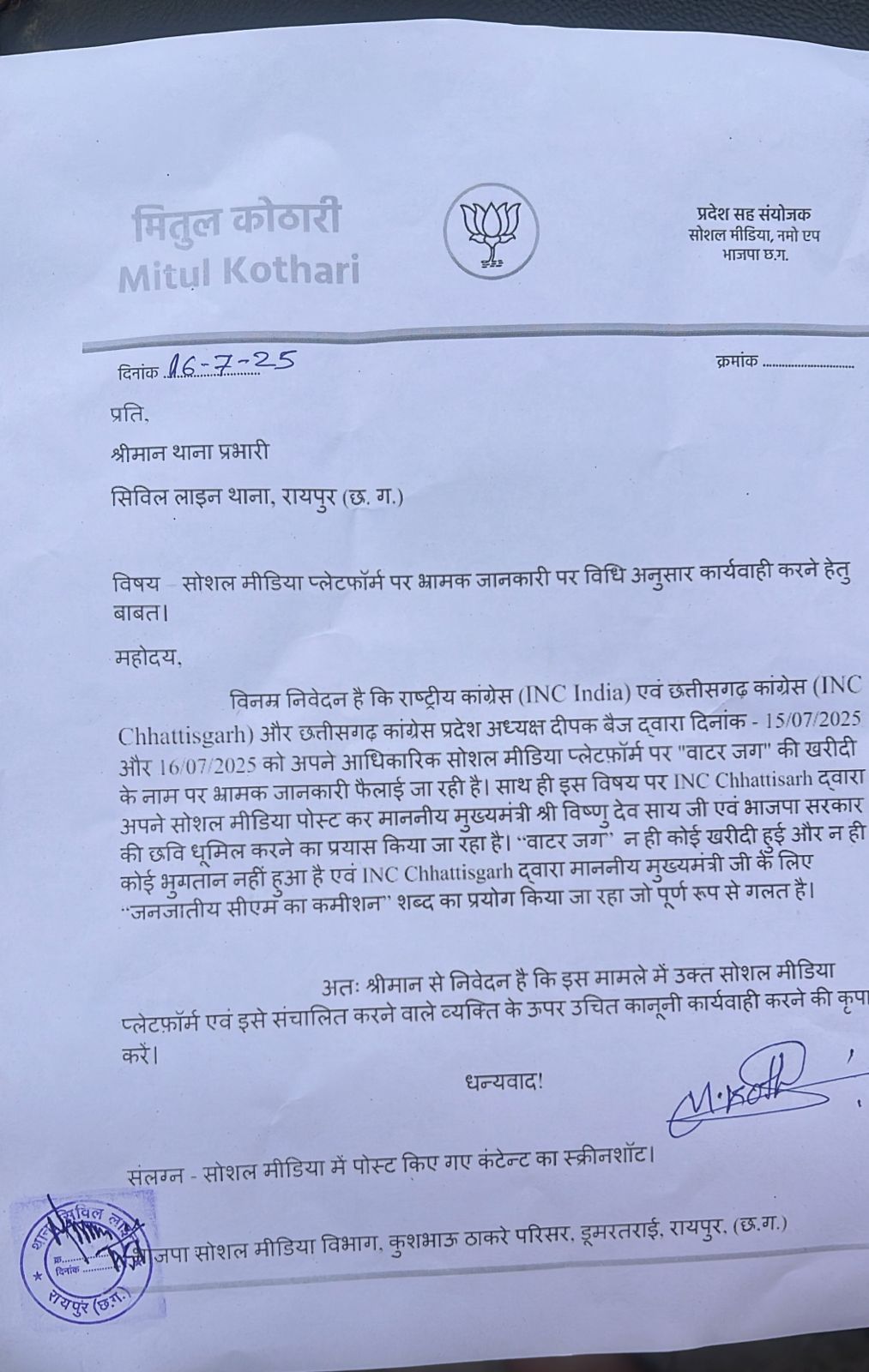 भाजपा सोशल मीडिया व नमो एप सेल के प्रदेश सह संयोजक मितुल कोठारी ने बताया कि पुलिस को सौंपे गए पत्र में कहा गया है कि राष्ट्रीय कांग्रेस, छत्तीसगढ़ कांग्रेस और कांग्रेस प्रदेश अध्यक्ष दीपक बैज द्वारा दिनांक 15 और 16 जुलाई को अपने आधिकारिक सोशल मीडिया प्लेटफॉर्म पर “वाटर जग” की खरीदी के नाम पर भामक जानकारी फैलाई जा रही है। साथ ही अ.भा. कांग्रेस द्वारा अपने सोशल मीडिया पोस्ट कर मुख्यमंत्री विष्णुदेव साय एवं भाजपा सरकार की छवि धूमिल करने का प्रयास किया जा रहा है, जबकि “वाटर जग’ के नाम पर न ही कोई खरीदी हुई और न ही कोई भुगतान हुआ है। इधर प्रदेश कांग्रेस द्वारा मुख्यमंत्री श्री साय के लिए “जनजातीय सीएम का कमीशन” शब्द का प्रयोग किया जा रहा है, जो पूर्ण रूप से गलत है। पत्र में इस मामले में उक्त सोशल मीडिया प्लेटफॉर्म एवं इसे संचालित करने वाले व्यक्ति पर उचित कानूनी कार्रवाई करने की मांग की गई है।