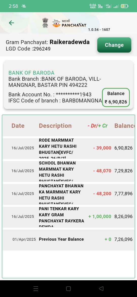 15वें वित्त की राशि में हेराफेरी का ताजा मामला बकावंड विकासखंड की ग्राम पंचायत रायकेरा देवड़ा से सामने आई है। ग्रामीणों का आरोप है है कि 15वें वित्त की राशि से ग्राम पंचायत में एक भी काम नहीं कराया गया है मगर सरपंच और सचिव ने विभिन्न कार्यों के नाम पर करीब ढाई लाख रुपए हड़प लिए हैं। हद तो तब हो गई जब सरपंच और सचिव ने नए बने ग्राम पंचायत भवन की मरम्मत के नाम पर 48 हजार 200 रुपए आहरित कर लिए। क्षेत्र क्रमांक 18 की जनपद सदस्य खेमेश्वरी कश्यप, रायकेरा देवड़ा की उप सरपंच एवं वार्ड 10 की पंच मीना कश्यप, पंच बुसाय झाली, लक्ष्मनी बघेल, सुबोध परगनिया, सलीम नाग, बंटू कश्यप, बनमाली गोयल, समंदु राम भारती, शंकर नाग, अन्नी भारती, मुन्नी भारती, लक्ष्मनी नेताम, विमला गोयल आदि ने मामले की शिकायत उच्च अधिकारियों से की है। शिकायत में बताया गया है कि सरपंच लखमी कश्यप और सचिव पदमावती कश्यप ने 15वें वित्त मद से 2 जून 2025 को हैंडपंप में मोटर पंप स्थापित करने के नाम पर 35 हजार रुपए निकाले, काम कराया नहीं, 16 जुलाई 2025 को रोड मरम्मत के नाम पर 39 हजार रुपए निकले, मगर मरम्मत कार्य कराया ही नहीं गया है, 16 जुलाई 2025 को ही स्कूल भवन मरम्मत के नाम पर 48 हजार 070रुपए निकाले मगर किसी तरह का मरम्मत कार्य हुआ ही नहीं है। इसी तरह 16 जुलाई 2025 की तिथि में ही पंचायत भवन मरम्मत के नाम पर 48 हजार 200रुपए आहरित किए गए हैं, जबकि ग्राम पंचायत भवन नया बना हुआ है और उसमें किसी तरह की मरम्मत की जरूरत ही नहीं है। इस तरह सरपंच और सचिव ने सरकारी धन की बंदरबांट कर ली है।