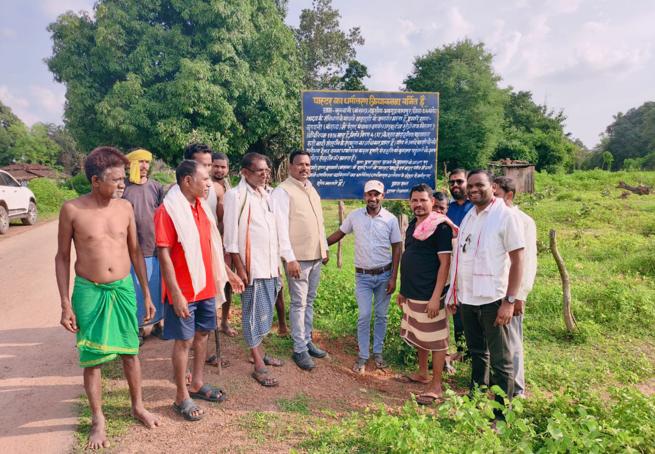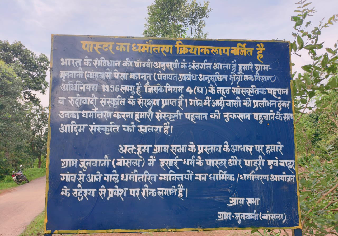 बस्तर संभाग में धर्मांतरण को लेकर लगातार बढ़ते विरोध और विवादों के बीच अब ग्राम स्तर पर विरोध मुखर होता जा रहा है। बस्तर संभाग के कांकेर जिला अंतर्गत भानुप्रतापपुर विकासखंड के ग्राम कुड़ाल के बाद अब बांसला पंचायत के आश्रित ग्राम जुनवानी में भी ईसाई धर्म प्रचारकों, पास्टरों और पादरियों के प्रवेश पर पूरी तरह प्रतिबंध लगा दिया गया है। यहां के ग्रामीणों ने गांव की सभी सीमाओं पर चेतावनी बोर्ड लगा दिए हैं, जिसमें साफ तौर पर उल्लेख किया गया है कि पास्टर, पादरी और बाहरी धर्मांतरित व्यक्तियों का प्रवेश व उनके किसी भी प्रकार के धार्मिक आयोजन पर गांव में पूर्ण रोक है। यह निर्णय ग्रामसभा के प्रस्ताव के आधार पर लिया गया है।ग्रामीणों द्वारा लगाए गए बोर्ड में भारत के संविधान की पांचवीं अनुसूची और पेसा कानून (1996) का हवाला देते हुए कहा गया है कि अनुसूचित क्षेत्रों में ग्रामसभा को अपनी परंपरा और संस्कृति की रक्षा का संवैधानिक अधिकार प्राप्त है। ग्राम जुनवानी के गायता राजेंद्र कोमरा ने बताया कि गांव में लगातार आदिवासी धर्म परिवर्तन कर रहे हैं, और पादरी, पास्टर आकर हमारे भोले भले ग्रामीणों के धर्म परिवर्तन करवाने कि कोशिश करते हैं, जिससे हमारी संस्कृति पर संकट आ गया है। इसी कारण हम लोगों ने गांव की सीमाओं पर बोर्ड लगाकर पास्टर-पादरी के प्रवेश पर प्रतिबंध लगाया है। कांकेर जिला पंचायत सदस्य देवेंद्र टेकाम ने इस कदम को शीतला माता और ठाकुर देव की परंपरा की रक्षा की दिशा में उल्लेखनीय बताते हुए इसे एक सांस्कृतिक सुरक्षा अभियान करार दिया। उन्होंने यह भी कहा कि ईसाई धर्म के कुछ लोग इस निर्णय का विरोध कर रहे हैं, लेकिन गांव की संस्कृति की रक्षा के लिए यह निर्णय आवश्यक था। जुनवानी गांव के ग्रामीण अपने आराध्य बूढ़ादेव, शीतला माता और दंतेश्वरी मैया के जयकारे लगाते हुए मिशनरी के विरोध में उतर आए हैं।