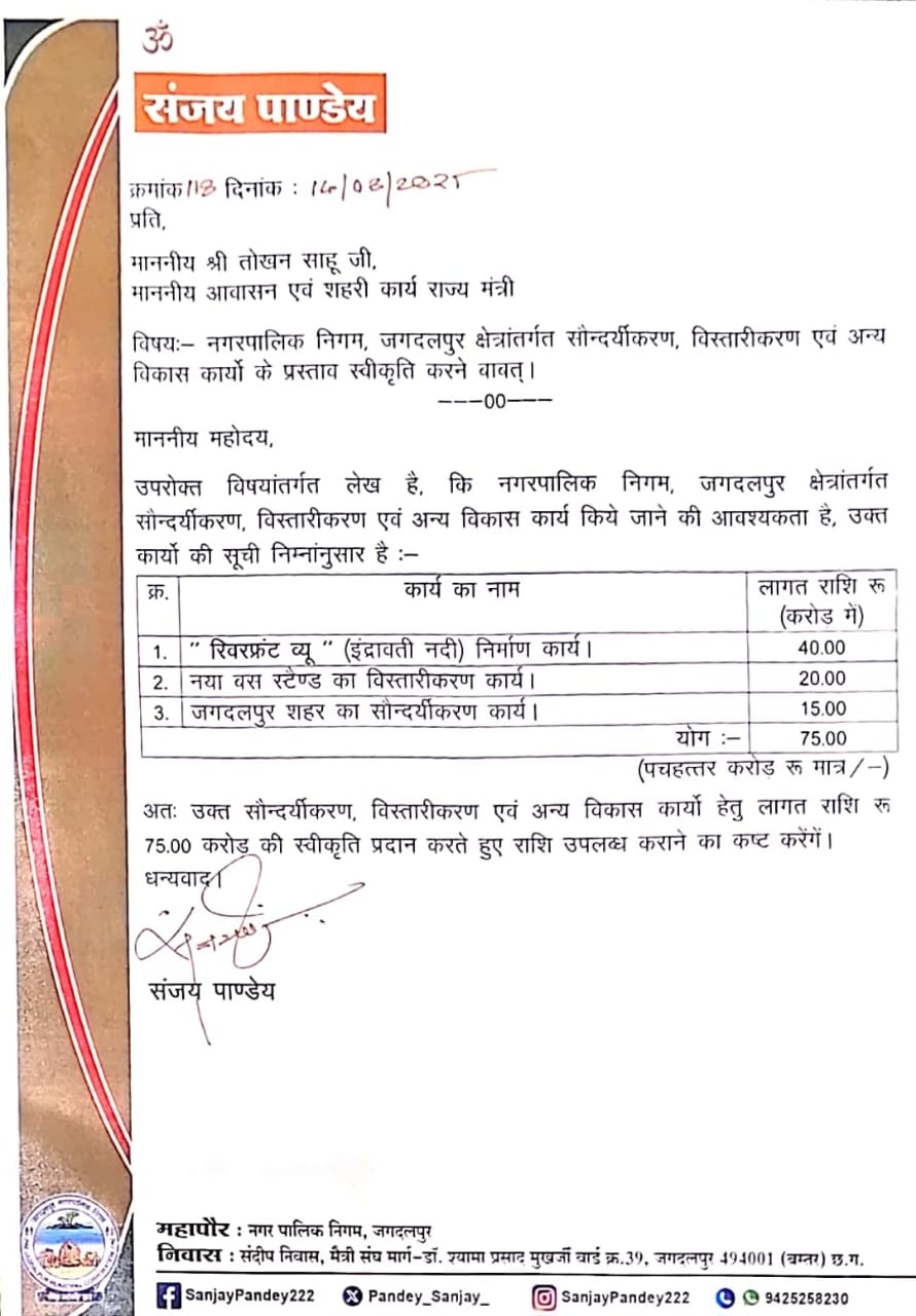 महापौर संजय पाण्डे ने अपने पत्र में लिखा है कि जगदलपुर संभाग मुख्यालय होने के साथ-साथ पर्यटन, व्यापार और सांस्कृतिक दृष्टि से भी अत्यंत महत्वपूर्ण शहर है। ऐसे में नगर निगम क्षेत्र के सौंदर्यीकरण और विस्तार कार्य समय की मांग है। प्रस्तावित कार्यों में रिवरफ्रंट व्यू (इंद्रावती नदी) निर्माण कार्य – 40 करोड़ रुपये। इस परियोजना के अंतर्गत इंद्रावती नदी किनारे रिवरफ्रंट का निर्माण किया जाएगा, जिससे शहरवासियों को मनोरंजन व भ्रमण का नया स्थल मिलेगा। साथ ही यह स्थान पर्यटन की दृष्टि से भी आकर्षण का केंद्र बनेगा।