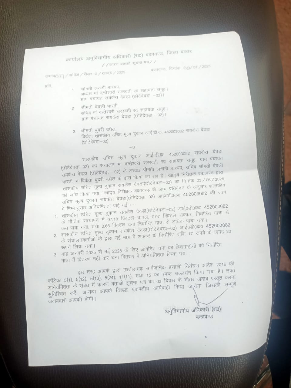 एसडीएम ने मां दंतेश्वरी सरस्वती स्व सहायता समूह ग्राम पंचायत रायकेरा देवड़ा की अध्यक्ष लखमी कश्यप, सचिव देवली भारती और राशन विक्रेता बुदरी बघेल को नोटिस भेजा है।शासकीय उचित मूल्य दुकान रायकेरा देवड़ा का संचालन मां दंतेश्वरी सरस्वती स्व सहायता समूह ग्राम पंचायत रायकेरा देवड़ा की अध्यक्ष लखमी कश्यप, सचिव देवली भारती, व विक्रेता बुदरी बघेल द्वारा किया जा रहा है। खाद्य निरीक्षक बकावंड द्वारा इस शासकीय उचित मूल्य दुकान का निरीक्षण किए जाने पर बड़ी गड़बड़ियां पाई गई थीं। राशन दुकान में 07.18 विवटल चावल और 0.07 क्विटल शक्कर निर्धारित मात्रा से कम पाए गए तथा 0.65 क्विटल चना निर्धारित मात्रा से अधिक पाया गया था। दुकान संचालनकर्ताओं द्वारा मई माह में शक्कर की निर्धारित दर 17 रूपये की जगह 20 रूपये ली गई थी। माह जनवरी में आंबटित चना का हितग्राहियों को निर्धारित मात्रा में वितरण नहीं कर चना वितरण में अनियमितता की गई थी। खाद्य निरीक्षक के प्रतिवेदन के आधार पर एसडीएम ने यह एक्शन लिया है।