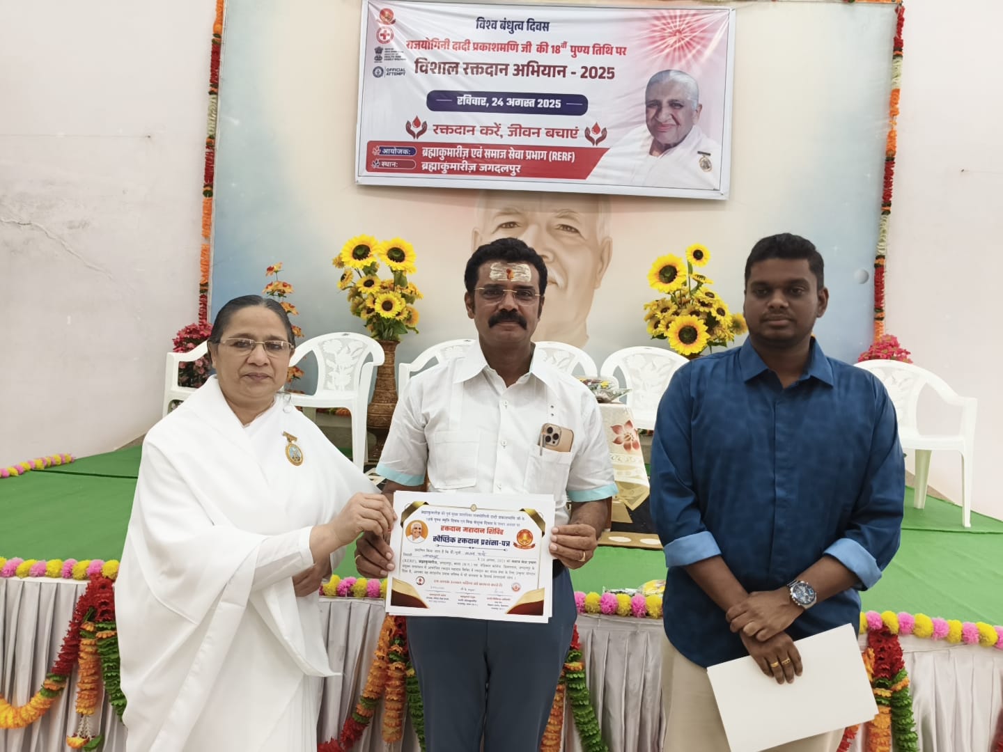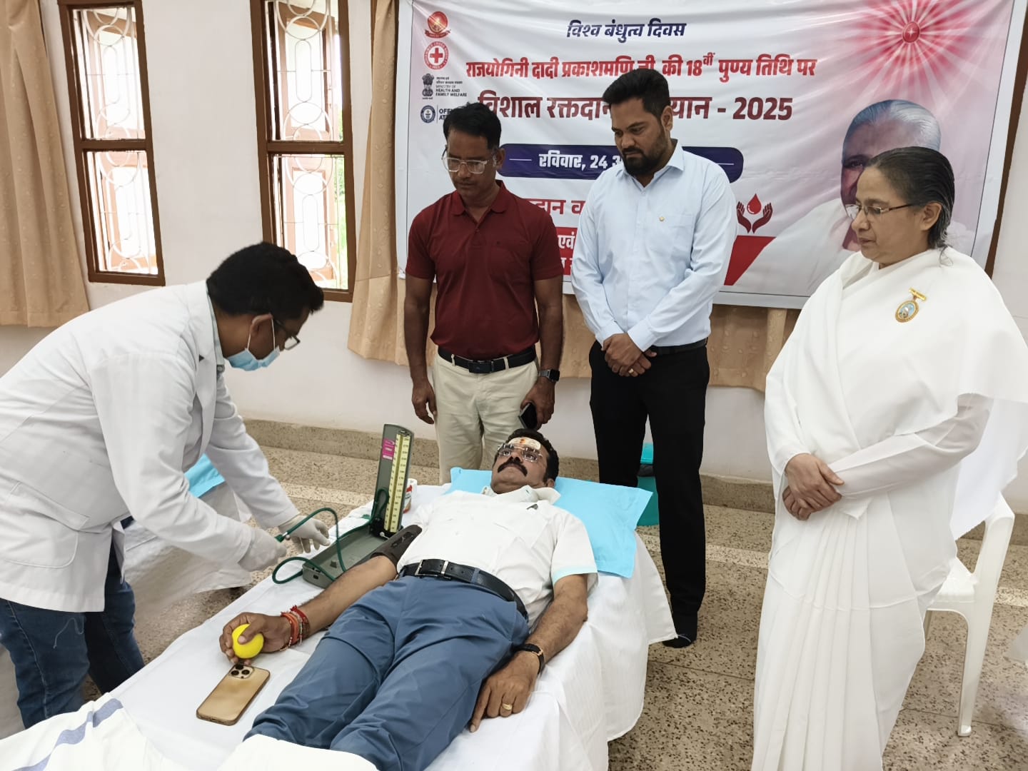 इस अवसर पर महापौर संजय पाण्डे ने कहा रक्तदान से बड़ा कोई दान नहीं है। सेवा भवना का यह सर्वोच्च अवदान है। मेयर संजय पाण्डेय ने कहा कि दादी प्रकाशमणि की स्मृति में हो रहा यह आयोजन केवल एक कार्यक्रम नहीं, बल्कि एक जीवनदायिनी पहल है। प्रजापिता ब्रह्माकुमारी संस्था में प्रवेश करते ही सकारात्मक ऊर्जा का अनुभव होने लगता है। यह वक्तव्य केवल औपचारिकता नहीं, बल्कि इस युग की सबसे बड़ी आवश्यकता है। आज जब समाज में तनाव, नकारात्मकता और स्वार्थ हावी हो रहे हैं, ऐसे में रक्तदान जैसी सेवा न केवल जीवन बचाती है बल्कि इंसानियत को भी जीवित रखती है। संस्था प्रमुख बीके मंजूषा ने बताया कि 22 से 25 अगस्त तक संपूर्ण भारत में रक्तदान शिविर आयोजित किए जा रहे हैं। एक लाख यूनिट रक्त संग्रह का लक्ष्य रखा गया है। इसे विश्व बंधुत्व दिवस के रूप में मनाया जा रहा है। एक लाख यूनिट रक्तदान का लक्ष्य केवल आंकड़ा नहीं, बल्कि वह जीवित प्रमाण है कि जब लोग संगठित होते हैं तो किसी भी बड़े लक्ष्य को हासिल करना संभव है।