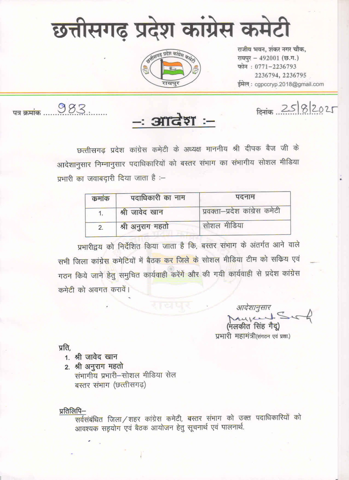 जगदलपुर। छत्तीसगढ़ प्रदेश कांग्रेस कमेटी के अध्यक्ष दीपक बैज के आदेशानुसार पीसीसी महामंत्री संगठन एवं प्रशासनिक मलकीत सिंह गैदू के द्वारा युवा कांग्रेस के राष्ट्रीय प्रवक्ता जावेद खान एवं प्रदेश आईटी सेल/सोशल मीडिया सेल के प्रदेश को-आर्डिनेटर अनुराग महतो को बस्तर संभाग का सोशल मीडिया संभागीय प्रभारी नियुक्त किया गया है। नवनियुक्त प्रभारी द्वय बस्तर संभाग जिले के अंतर्गत सोशल मीडिया टीम को सक्रिय एवं सोशल मीडिया टीम के गठन हेतु आवश्यक कार्य करेंगे।
