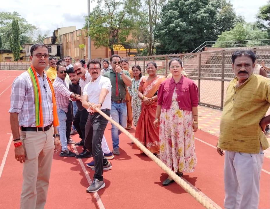 जगदलपुर। फिट इंडिया मूवमेंट के अंतर्गत जिला प्रशासन एवं खेल एवं युवा कल्याण विभाग के तत्वावधान में 31 अगस्त को प्रियदर्शनी स्टेडियम जगदलपुर में रस्सी खींच प्रतियोगिता का आयोजन किया गया। इस प्रतियोगिता में नगर निगम पार्षद दल और जिला प्रशासन के बीच मुकाबला हुआ। नगर निगम पार्षद दल की ओर से कप्तान महापौर संजय पांडे एवं जिला प्रशासन की ओर से कप्तान अपर कलेक्टर प्रवीण वर्मा रहे। रोमांचक मुकाबले में नगर निगम पार्षद दल ने जिला प्रशासन को हराकर जीत अपने नाम की। जीतने एवं उपविजेता टीमों को मोमेंटो देकर सम्मानित किया गया। कार्यक्रम के दौरान नगर निगम के पार्षदों द्वारा दौड़ प्रतियोगिता का भी आयोजन किया गया। इसमें पुरुष वर्ग में श्याम सुंदर बघेल ने प्रथम स्थान प्राप्त किया, वहीं महिला वर्ग में नेहा ध्रुव और भाजपा संगठन से अविनाश श्रीवास्तव ने प्रथम स्थान हासिल किया। सभी विजेताओं को महापौर संजय पांडे द्वारा पुरस्कार प्रदान कर सम्मानित किया गया।