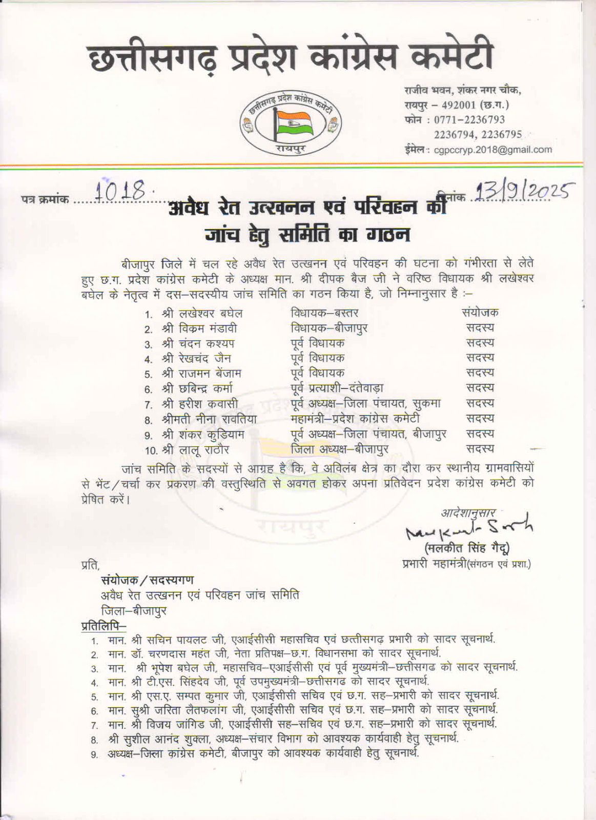 ० प्रदेश कांग्रेस कमेटी ने बनाई 10 सदस्यीय टीम
