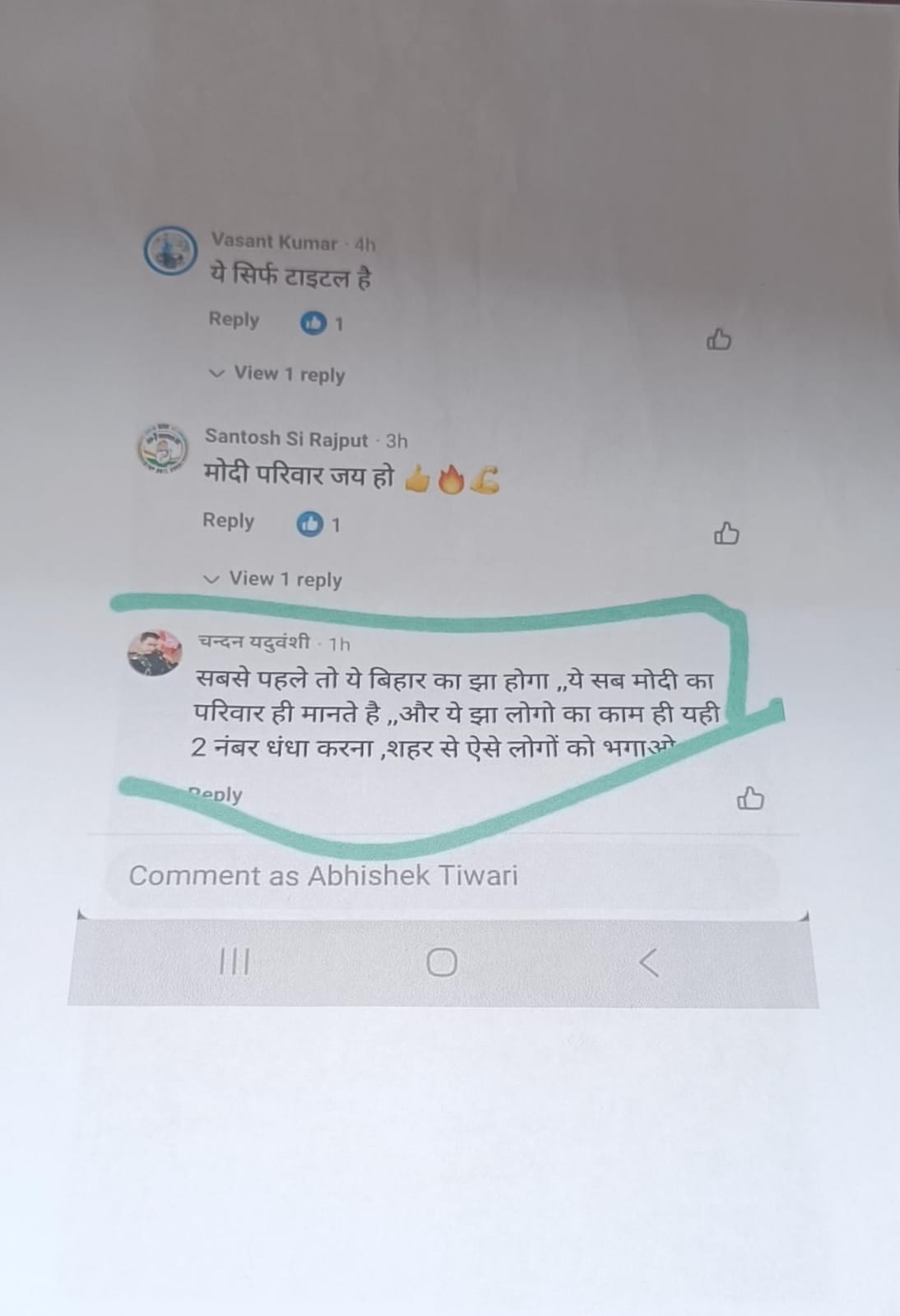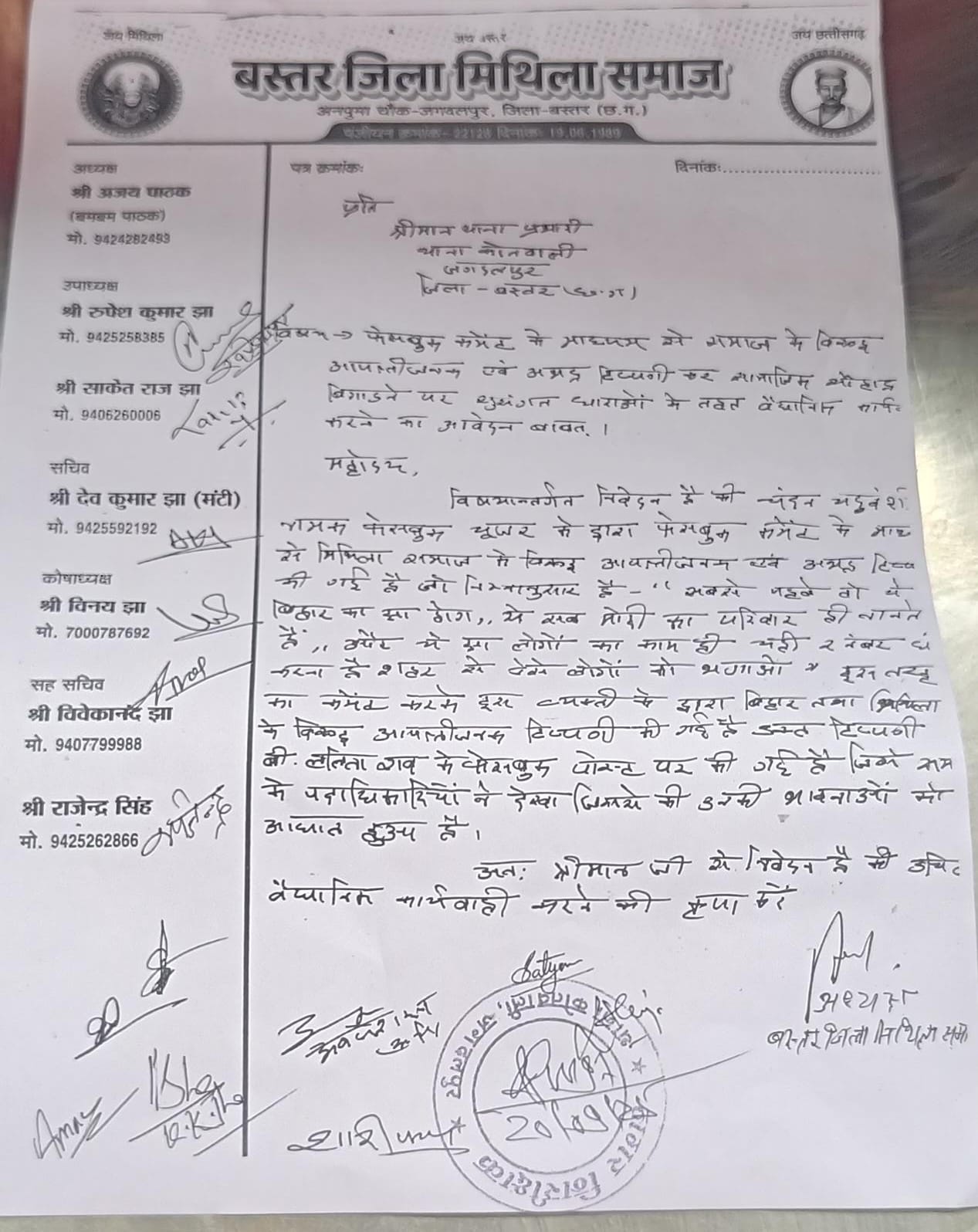 बस्तर जिला मिथिला समाज ने पुलिस को दिए गए आवेदन में कहा है कि फेसबुक कमेंट के माध्यम से समाज के विरुद्ध बेहद ही आपत्तिजनक एवं अभद्र टिप्पणी कर सामाजिक सौहाद्र बिगड़ने की कोशिश एक युवक द्वारा की गई है। अतः युवक के खिलाफ सुसंगत धाराओं के तहत वैद्यानिक कार्रवाई की जाए।आवेदन में बताया गया है कि चंदन यदुवंश नामक फेसबुक यूजर द्वारा फेसबुक कमेंट के माध्यम से मिथिला समाज के विरुद्ध आपत्तिजनक एवं अभद्र टिप्पणी की गई है जो निम्नानुसार है “सबसे पहले तो ये बिहार के झा लोग, ये सब मोदी को परिवार मानते हैं। और ये झा लोगों का काम ही यही 2 नंबर का धंधा करना है। शहर से ऐसे लोगो को भगाओ।” समाज का कहना है कि इस तरह का कमेंट करके इस व्यक्ति द्वारा बिहार तथा मिथिला समाज का अपमान किया गया है। यह टिप्पणी बी. ललिता राव की फेसबुक पोस्ट पर की गई है जिसे समाज के पदाधिकारियों ने देखा जिससे उनकी भावनाओं को आघात पहुंचा है।