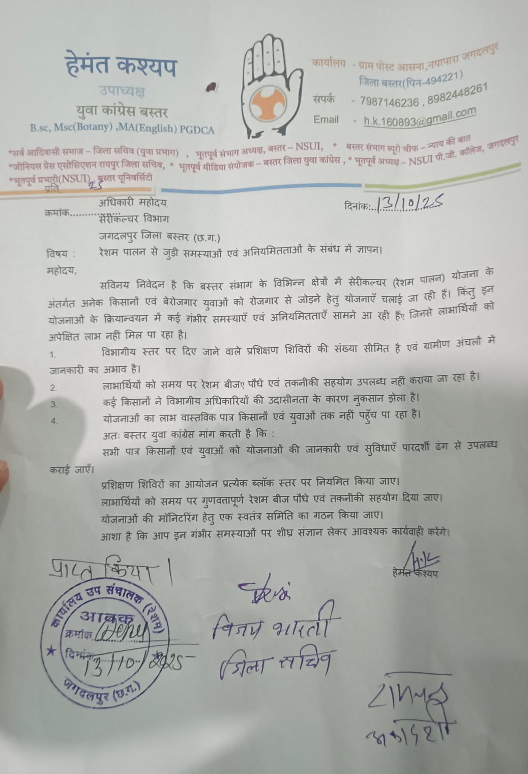 जगदलपुर। रेशम पालन (सेरीकल्चर) विभाग में हो रही अनियमितताओं और किसानों की समस्याओं को लेकर बस्तर युवा कांग्रेस ने विभाग को ज्ञापन सौंपा। यह ज्ञापन युवा कांग्रेस जिला उपाध्यक्ष हेमंत कश्यप के नेतृत्व में सेरीकल्चर विभाग, जगदलपुर के अधिकारी को सौंपा गया।