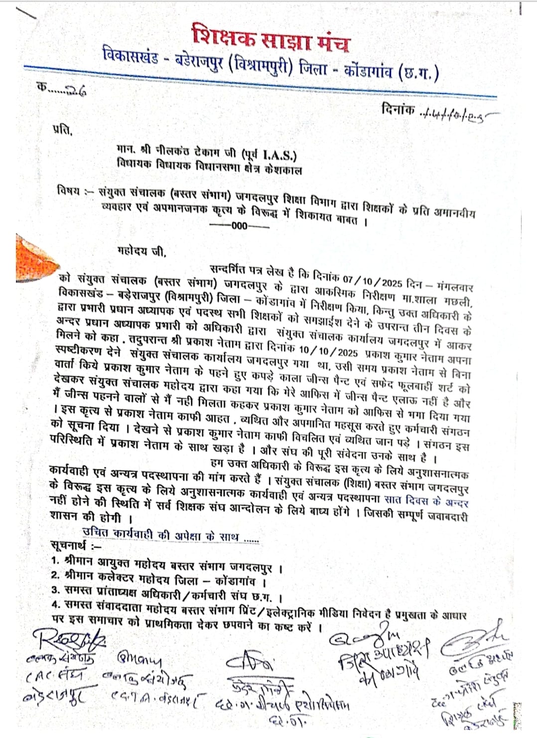 मिली जानकारी के अनुसार माध्यमिक शाला मचली के आदिवासी शिक्षक प्रकाश नेताम जब अपना स्पष्टीकरण देने संयुक्त संचालक कार्यालय पहुंचे, तो वे शालीन सफेद शर्ट और काले जींस पैंट पहने हुए थे।शिक्षक प्रकाश नेताम साफ सुथरे, साधारण और मर्यादित पहनावे में थे, लेकिन संयुक्त संचालक की दृष्टि काम से ज़्यादा शिक्षक के पहनावे पर थी । संयुक्त संचालक, जिन्हें शिक्षक का स्पष्टीकरण सुनना था, उन्होंने शिक्षक के पहनावे पर आपत्ति और कड़ी नाराजगी जताई। फिर यह कहते हुए शिक्षक श्री नेताम को कार्यालय से बाहर निकाल दिया कि “मेरे ऑफिस में जींस पैंट नहीं चलता। जबकि उसी कार्यालय के अधिकांश अधिकारी कर्मचारी जींस पहनते हैं, जिनके साथ उन्होंने आफिस में फोटो भी खिंचवाई है। सवाल उठ रहा है कि क्या अब सरकारी कार्यालयों में योग्यता से ज़्यादा यूनिफॉर्म की जांच होगी? शिक्षकों के प्रति अपमान जनक टिप्पणी एवं अशोभनीय व्यवहार को लेकर शिक्षक सांझा मंच के बैनर तले विभिन्न शिक्षक संगठनों ने विरोध का बिगुल फूंक दिया है। केशकाल विधायक नीलकंठ टेकाम को संयुक्त संचालक (शिक्षा) बस्तर संभाग के खिलाफ कार्रवाई करने एवं उन्हें हटाने की मांग को लेकर बड़ी संख्या में संगठन पदाधिकारियों ने ज्ञापन सौंपा। भारतीय जनता पार्टी के जिला अध्यक्ष सेवक राम नेताम को भी कोंडागांव प्रवास के दौरान मंच के जिला पदाधिकारियों ने मुलाकात कर जेडी के आंतक एवं सोशल मीडिया में शिक्षकों कको अपमानित करने के पोस्ट की जानकारी देते हुए तत्काल कार्रवाई की मांग की। शासन प्रशासन द्वारा दीपावली अवकाश तक कार्रवाई नहीं होने की स्थिति में संभाग सहित प्रदेश स्तर पर बड़ा आंदोलन एकजुट होकर करेंगे।