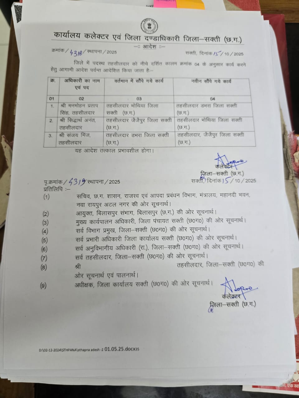 जिसमें मनमोहन प्रताप सिंह तहसीलदार को भोथिया से डभरा, सिद्धार्थ अनंत तहसीलदार को जैजैपुर से भोथिया, संजय मिंज तहसीलदार को डभरा से जैजैपुर भेजा गया है वही बालेश्वर राम अपर कलेक्टर डभरा को जिला कार्यालय सक्ती, विनय कुमार कश्यप डिप्टी कलेक्टर को जिला कार्यालय सक्ती से अनुविभागीय अधिकारी (रा.) एवं अनुविभागीय दंडाधिकारी डभरा का दायित्व दिया गया है।
