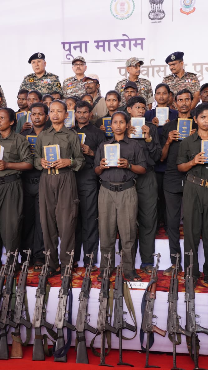 (अर्जुन झा) जगदलपुर। तारीख 17 अक्टूबर, दिन शुक्रवार। यह तारीख और दिन नक्सल गढ़ बस्तर के लिए ऐतिहासिक साबित हुए हैं। जिन हाथों में नफरती बंदूकें हुआ करती थीं, उन हाथों में प्रेम के प्रतीक महकते गुलाब के फूल और पावन संविधान की प्रति देख समूचा बस्तर आल्हादित हो उठा, हर तरफ खुशी की लहर दौड़ गई। पुलिस द्वारा संचालित ‘पूना मारगेम अर्थात पुनर्वास से पुनर्जीवन’ कार्यक्रम के तहत एक बार फिर दो सैकड़ा से अधिक नक्सलियों ने आत्मसमर्पण कर समाज की मुख्यधारा में लौटने का संकल्प लिया। यह प्रेरणादायक आयोजन शुक्रवार को पुलिस लाइन, जगदलपुर में आयोजित हुआ, जिसमें प्रदेश के पुलिस महानिदेशक अरुण देव गौतम मुख्य अतिथि के रूप में उपस्थित रहे।