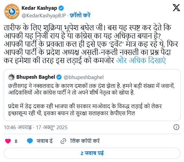 राज्य के मंत्री केदार कश्यप ने बघेल के बयान पर तीखा तंज कसते हुए एक्स (Twitter) पर लिखा तारीफ के लिए शुक्रिया भूपेश बघेल जी, बस यह स्पष्ट कर दीजिए कि यह आपकी निजी राय है या कांग्रेस पार्टी का अधिकृत बयान? आपकी पार्टी के प्रवक्ता इसे ‘इवेंट’ बता रहे थे और प्रदेश अध्यक्ष सवाल उठा रहे थे कि ये नक्सली असली हैं या नकली!