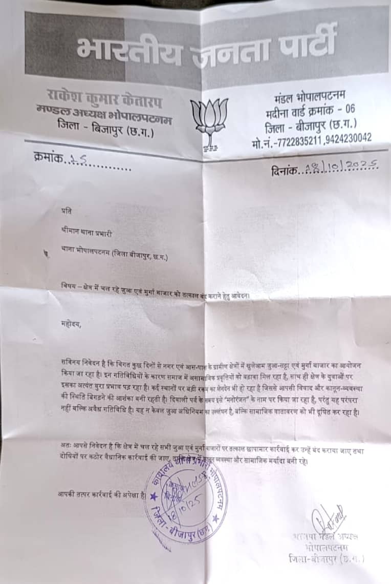 भोपालपटनम। भारतीय जनता पार्टी के मंडल अध्यक्ष राकेश कुमार केतारप ने भोपालपटनम थाना प्रभारी को आवेदन सौंपते हुए नगर एवं आसपास के ग्रामीण इलाकों में चल रहे अवैध जुआ तथा मुर्गा बाजारों पर तत्काल रोक लगाने की मांग की है। उन्होंने कहा कि पिछले कुछ दिनों से क्षेत्र में खुलेआम जुआ, सट्टा और मुर्गा लड़ाई के बाजार लगाए जा रहे हैं, जिससे समाज में असामाजिक प्रवृत्तियों को बढ़ावा मिल रहा है।