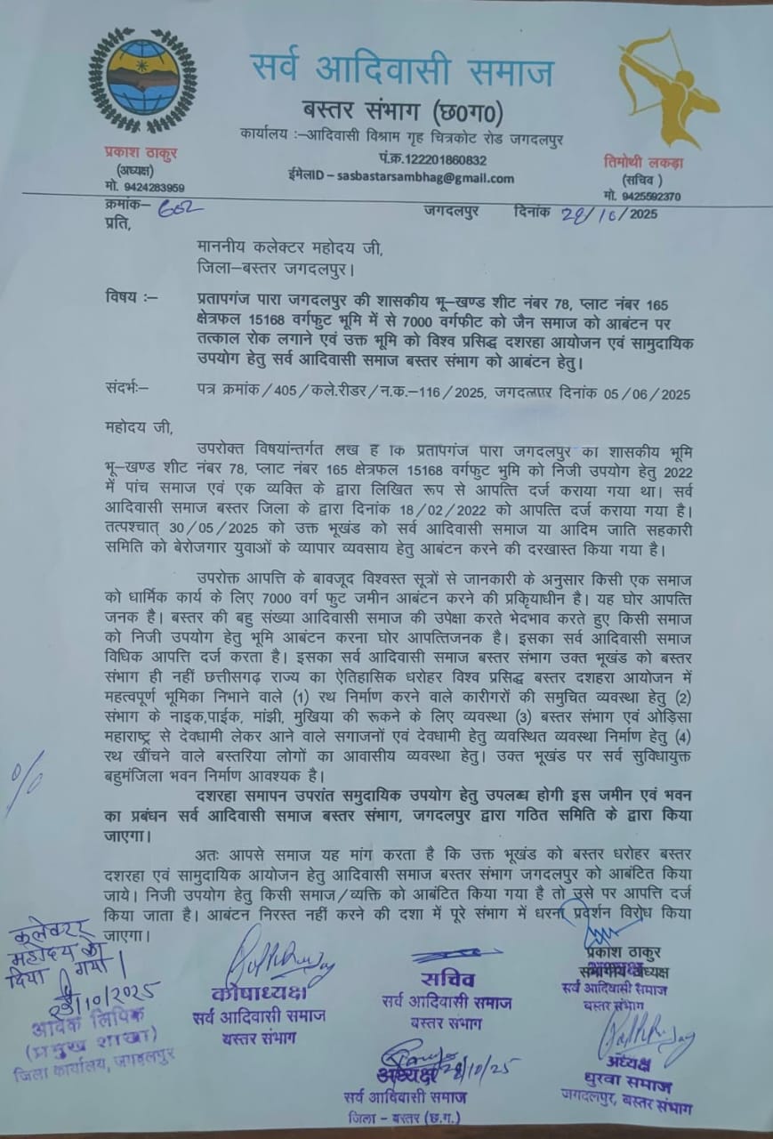 इस मुद्दे को लेकर सर्व आदिवासी समाज ने कलेक्टर को आवेदन सौंपा है। आवेदन में कहा गया है कि प्रतापगंज पारा जगदलपुर स्थित शासकीय भूमि भूखंड शीट नंबर 78, प्लाट नंबर 165 क्षेत्रफल 15168 वर्गफीट भुमि के निजी उपयोग पर वर्ष 2022 में पांच समाजों एवं एक व्यक्ति द्वारा लिखित रूप से आपत्ति दर्ज कराई गई थी। सर्व आदिवासी समाज बस्तर जिला द्वारा भी 18 फरवरी 2022 को आपत्ति दर्ज कराई जा चुकी है। इसके बाद 30 मई 2025 को उक्त भूखंड को सर्व आदिवासी समाज या आदिम जाति सहकारी समिति को बेरोजगार युवाओं के व्यापार व्यवसाय हेतु आबंटित करने की आवेदन किया गया है।इसके बावजूद एक समाज को धार्मिक कार्य के लिए 7000 वर्गफीट जमीन आबंटन करने की प्रक्रिया शुरू कर दी गई है। यह घोर आपत्ति जनक है। बस्तर के बहुसंख्य आदिवासी समाज की उपेक्षा और भेदभाव करते हुए दीगर समाज को निजी उपयोग हेतु भूमि आबंटन करना घोर आपत्तिजनक है। इसका सर्व आदिवासी समाज ने कड़ा विरोध किया है। सर्व आदिवासी समाज ने कहा है कि ऐतिहासिक धरोहर विश्व प्रसिद्ध बस्तर दशहरा आयोजन में महत्वपूर्ण भूमिका निभाने वाले रथ निर्माता कारीगरों, संभाग के नाइक, पाईक, मांझी, मुखियाओं, बस्तर संभाग एवं ओड़िशा, महाराष्ट्र से देवधामी लेकर आने वाले सगाजनों एवं देवधामी हेतु व्यवस्थित व्यवस्था निर्माण, रथ खींचने वाले बस्तरिया लोगों का आवासीय व्यवस्था के लिए उक्त भूखंड पर सर्व सुविधायुक्त बहुमंजिला भवन निर्माण आवश्यक है। दशरहा समापन उपरांत समुदायिक उपयोग हेतु यह भवन उपलब्ध होगा इस जमीन एवं भवन का प्रबंधन सर्व आदिवासी समाज बस्तर संभाग, जगदलपुर द्वारा गठित समिति करेगी। आदिवासी समाज ने उक्त भूखंड को बस्तर दशरहा एवं सामुदायिक आयोजन हेतु आदिवासी समाज बस्तर संभाग जगदलपुर को आबंटित करने की मांग की है। जैन समाज को भूमि आबंटन निरस्त नहीं करने पर पूरे संभाग में धरना प्रदर्शन करने की चेतावनी दी गई है।
