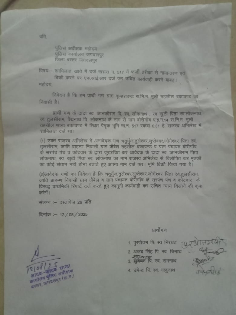 शिकायतकर्ताओं ने बताया है कि उनके दादा स्व. जानकीराम आत्मज स्व. लोकनाथ, स्व. खुटी आत्मज स्व. लोकनाथ, स्व. तुलसीराम, वैद्यनाथ आत्मज लोकनाथ के नाम से ग्राम बोरीगांव पटवारी हलका नंबर 14 में स्थित पैतृक भूमि खसरा नंबर 517 रकबा 0.31 हेक्टेयर राजस्व अभिलेख में शामिलात दर्ज था। राजस्व अभिलेख में अनावेदक गण चतुर्भुज, तुलेश्वर, लुप्तेश्वर, जोगेश्वर पिता स्व. तुलसीराम जाति ब्राहम्ण निवासी ग्राम जैबेल तहसील बकावंड व ग्राम पंचायत बोरीगांव के सरपंच पंच व कोटवार द्वारा कूटरचित कर आवेदक के दादा स्व. जानकीराम पिता लोकनाथ, स्व. खुटी पिता स्व. लोकनाथ का नाम राजस्व अभिलेख से विलोपित कर मृतकों की कोई संतान नहीं होना बताते हुए अपना नाम दर्ज कर भूमि ब्रिक्री कर दी गई है।