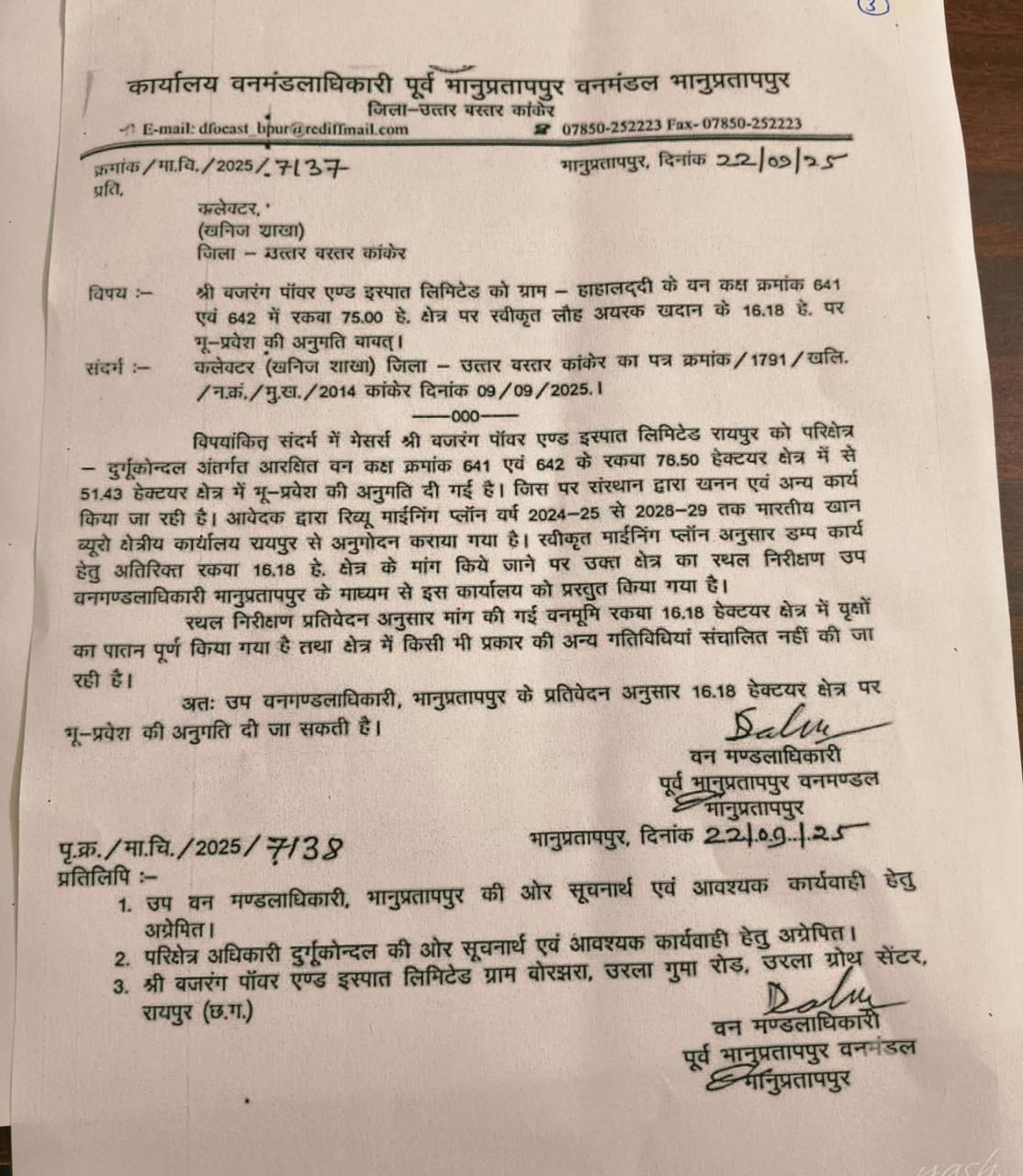 नियमों की अनदेखी ‘भू-प्रवेश’ की अनुमति जारी करने से पहले यह अनिवार्य था कि विच्छेदित काष्ठ (कटे हुए पेड़ की लकड़ी) का परिवहन पूर्ण हो जाए।आरोप है कि वन अधिकारियों ने जानबूझकर यह तथ्य छुपाया कि मौके से लकड़ी का परिवहन नहीं हुआ है, और गलत निरीक्षण प्रतिवेदन दिया गया। इस तरह कलेक्टर कार्यालय को गुमराह करते हुए, अवैध रूप से नियत समय से पूर्व भू-प्रवेश की अनुमति दिला दी गई। नियमों के इस घोर उल्लंघन के बावजूद, कलेक्टर कार्यालय ने पत्र क्र. 2302, दिनांक 17/ 10/ 2025 द्वारा मेसर्स श्री बजरंग पॉवर एंड इस्पात लि. के लिए भू-प्रवेश की अनुमति जारी कर दी।