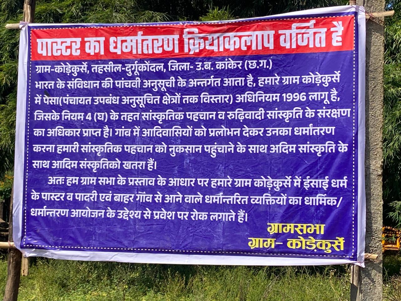 ग्राम कोड़ेकुर्से में 12 नवंबर को सुबह लगभग 8 बजे ग्रामीणों बड़ी बैठक कर निर्णय लिया कि धर्म परिवर्तन मूल धर्म, संस्कृति और परंपराओं पर बड़ा खतरा बन गया है। बाहरी लोग गांव में आकर और भोले भाले ग्रामीणों को बहला फुसला कर, प्रलोभन देकर उनका धर्म परिवर्तन करा लेते हैं। इसस जातीय मतभेद के हालात बन जाते हैं। इसलिए पादरी पास्टर के गांव में प्रवेश पर प्रतिबंध लगाया जाएगा। इस संबंध में गांव के प्रवेश द्वार पर बोर्ड भी लगा दिया गया है। ग्रामीणों का कहना है कि गांव में धर्म परिवर्तन की गतिविधियों को रोकने के उद्देश्य से यह निर्णय लिया गया है। इस दौरान ग्राम के गायता संपत हिड़को, अजित हिड़को, जवाहर ठाकुर, पुनऊराम तारम, ओम मरकाम, सहदेव बघेल, रघुनंदन गोस्वामी, अमरचंद जैन सहित बड़ी संख्या में ग्रामीण मौजूद रहे। ग्रामीणों के इस कदम से क्षेत्र में चर्चा का माहौल बन गया है। बताया जा रहा है कि यह निर्णय सामूहिक बैठक में लिया गया ताकि गांव में सामाजिक सौहार्द और परंपरागत आस्था बनी रहे। बता दें कि यह अभियान बस्तर संभाग के गांव गांव में चल रहा है। अब तक दर्जनों गांवों में ऐसा कदम उठाया जा चुका है। ज्ञात हो कि इसी तहसील के एक गांव में निषाद केंवट समाज के एक कन्वर्टेड युवक के अंतिम संस्कार को लेकर बड़ा हंगामा मचा था। गांव में 3-4 दिनों तक तनावपूर्ण हालात बने रहे। पुलिस और प्रशासन को भी हस्तक्षेप करना पड़ा, तब कहीं जाकर युवक का अंतिम संस्कार कहीं और हो पाया।