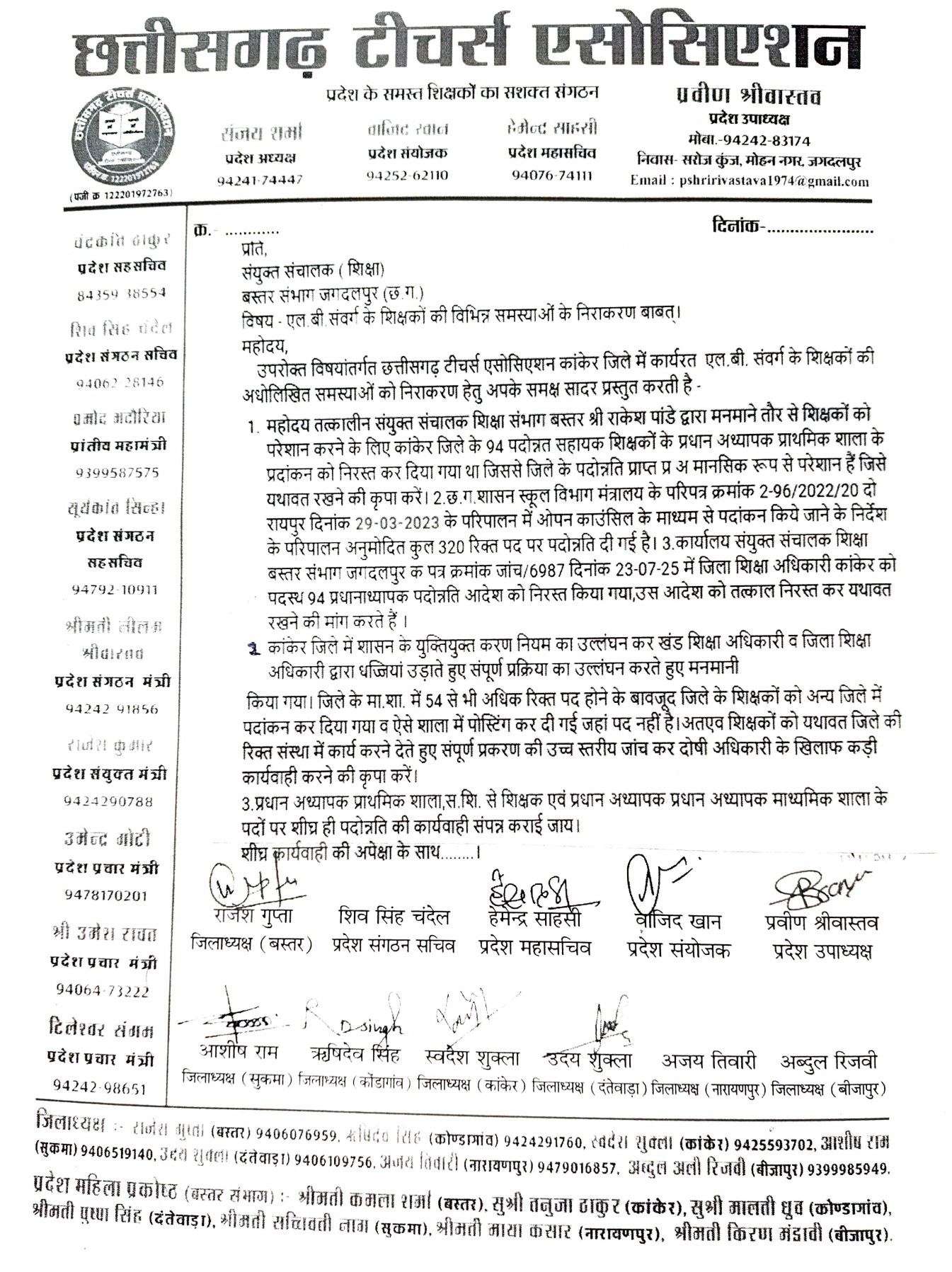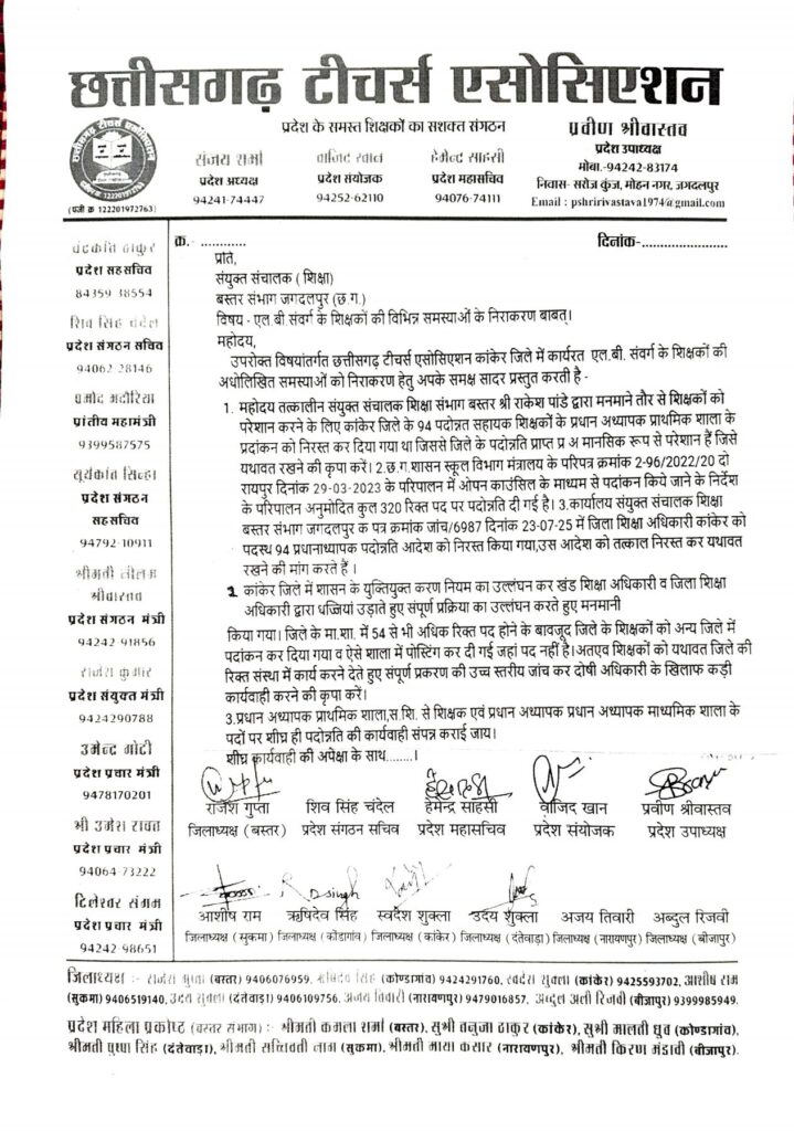 ज्ञापन में कहा गया है कि तत्कालीन संयुक्त संचालक शिक्षा संभाग बस्तर राकेश पांडे द्वारा मनमाने तौर पर शिक्षकों को परेशान करने के लिए कांकेर जिले के 94 पदोन्नत सहायक शिक्षकों के प्रधान अध्यापक प्राथमिक शाला के पदांकन को निरस्त कर दिया गया था। इसके कारण जिले के पदोत्रति प्राप्त प्रधान पाठक मानसिक रूप से परेशान हैं जिसे यथावत रखा जाए। स्कूल विभाग मंत्रालय के परिपत्र के परिपालन में ओपन काउंसिल के माध्यम से पर्दाकन किये जाने के निर्देशा के परिपालन अनुमोदित कुल 320 रिक्त पद पर पदोन्नति दी गई है। कार्यालय संयुक्त संचालक शिक्षा बस्तर संभाग जगदलपुर के पत्र में जिला शिक्षा अधिकारी कांकेर को पदस्थ 94 प्रधानाध्यापक पदोन्नति आदेश को निरस्त किया गया, उस आदेश को तत्कात रद्द कर यधावत रखा जाए। कांकेर जिले में शासन के युक्तियुक्तकरण नियम का उल्लंघन कर खंड शिक्षा अधिकारी व जिला शिक्षा अधिकारी द्वारा धज्जियां उड़ाते हुए मनमानी की गई है। जिले के मिडिल स्कूलों में 54 से भी अधिक रिक्त पद होने के बावजूद जिते के शिक्षकों का अन्य जिले में पदांकन कर दिया गया है व ऐसी शालाओं में पोस्टिंग कर दी गई जहां पद नहीं है। ऐसे शिक्षकों को यथावत जिले की रिक्त संस्थाओं में पदस्थ कर संपूर्ण प्रकरण की उच्च सतरीय जांच कर दोषी अधिकारी के खिलाफ कड़ी कार्रवाई की जाए। प्रधान अध्यापक प्राथमिक शाला सहायक शिक्षक से शिक्षक एवं प्रधान अध्यापक माध्यमिक शाला के पदों पर शीघ्र ही पदोन्नति की प्रक्रिया पूरी कराई जाए।