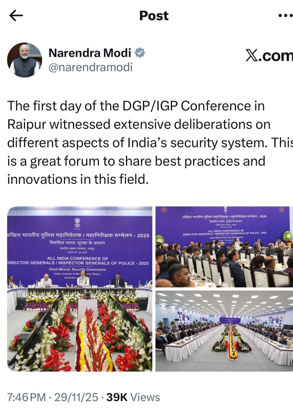 खुद प्रधानमंत्री नरेंद्र मोदी ने इस मेगा ब्रेनस्टॉर्मिंग सेशन की तारीफ में जमकर शब्द खर्च किए। अपने X पोस्ट में पीएम ने लिखा –रायपुर में चल रही DGP/IGP कॉन्फ्रेंस के पहले दिन भारत की सुरक्षा व्यवस्था के हर कोने को खंगाला गया। यह आयोजन बेस्ट प्रैक्टिस, इनोवेशन और अनुभव साझा करने का बेमिसाल प्लेटफॉर्म है। देश के बहादुर पुलिस बल को सलाम!