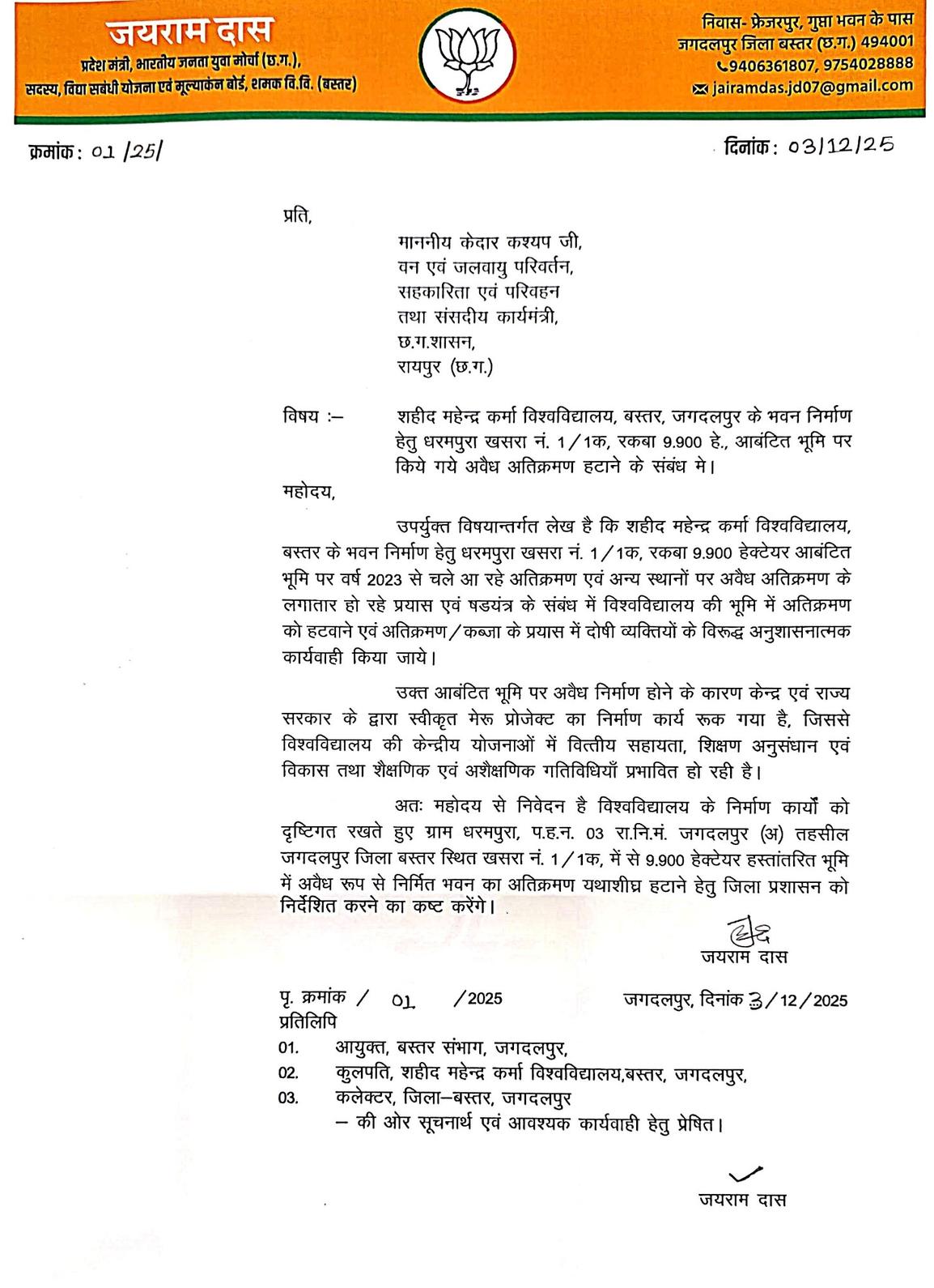 शहीद महेंद्र कर्मा विश्वविद्यालय जगदलपुर बस्तर के भवन एवं अन्य निर्माणों के लिए शासन प्रशासन द्वारा नगर के धरमपुरा में खसरा नं. 1/1 क, की रकबा 9, 900 हेक्टेयर आबंटित भूमि पर पर वर्ष 2023 से चले आ रहे अतिक्रमण एवं अन्य स्थानों पर अवैध अतिक्रमण के लगातार हो रहे प्रयास और षडयंत्र का खेल चल रहा है।विश्वविद्यालय प्रशासन ने बस्तर जिला प्रशासन और राज्य शासन को पत्र भेजकर विश्वविद्यालय की भूमि से अतिक्रमण को हटवाने एवं अतिक्रमण के प्रयास के दोषी व्यक्तियों के विरूद्ध अनुशासनात्मक कार्रवाई करने की मांग की है। बताया गया है कि आबंटित भूमि पर अवैध निर्माण होने के कारण केंद्र एवं राज्य सरकार द्वारा स्वीकृत मेरू प्रोजेक्ट का निर्माण कार्य रूक गया है, जिससे विश्वविद्यालय की केंद्रीय योजनाओं में वित्तीय सहायता, शिक्षण अनुसंधान एवं विकास तथा शैक्षणिक एवं अशैक्षणिक गतिविधियां प्रभावित हो रही हैं। विश्वविद्यालय भवन के निर्माण कार्यों को दृष्टिगत रखते हुए ग्राम धरमपुरा, पटवारी हल्का नंबर 03, राजस्व निरीक्षक मंडल जगदलपुर (अ) तहसील जगदलपुर स्थित खसरा नं. 1/1क, में से 9, 900 हेक्टेयर हस्तांतरित भूमि में अवैध रूप से निर्मित भवन का अतिक्रमण यथाशीघ्र हटाने की मांग की गई है।