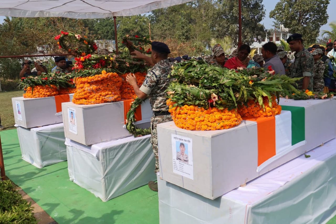 बीजापुर की नई पुलिस लाइन में शहीद जवानों को गमगीन माहौल में अंतिम श्रद्धांजलि दी गई। कार्यक्रम में दंतेवाड़ा विधायक चैतराम अटामी, बीजापुर विधायक विक्रम मंडावी, IG सुंदरराज पी., डीआईजी CRPF, डीआईजी पुलिस कमलोचन कश्यप, बीजापुर SP जितेंद्र यादव, दंतेवाड़ा SP गौरव राय समेत बड़ी संख्या में अधिकारी, जवान और ग्रामीण शामिल हुए। शहीदों को गार्ड ऑफ ऑनर दिया गया और ‘अमर रहे’ के नारों के बीच उनके पार्थिव शरीरों को गृह ग्राम रवाना किया गया। विदाई के दौरान परिजन और साथी जवान भावुक हो उठे। अधिकारियों ने बताया कि इलाके में दोबारा सर्चिंग बढ़ाई गई है और मुठभेड़ में सक्रिय अन्य नक्सलियों की तलाश जारी है। सुरक्षा बलों का कहना है कि यह सफलता बस्तर क्षेत्र में नक्सलवाद को कमजोर करने में निर्णायक साबित होगी।
