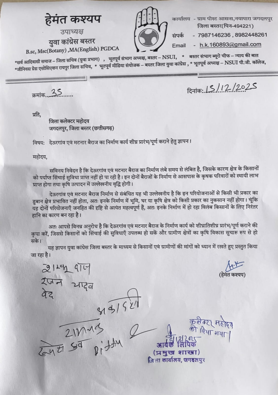 0 युवा कांग्रेस नेता हेमंत कश्यप ने कलेक्टर हरिस एस को सौंपा ज्ञापन