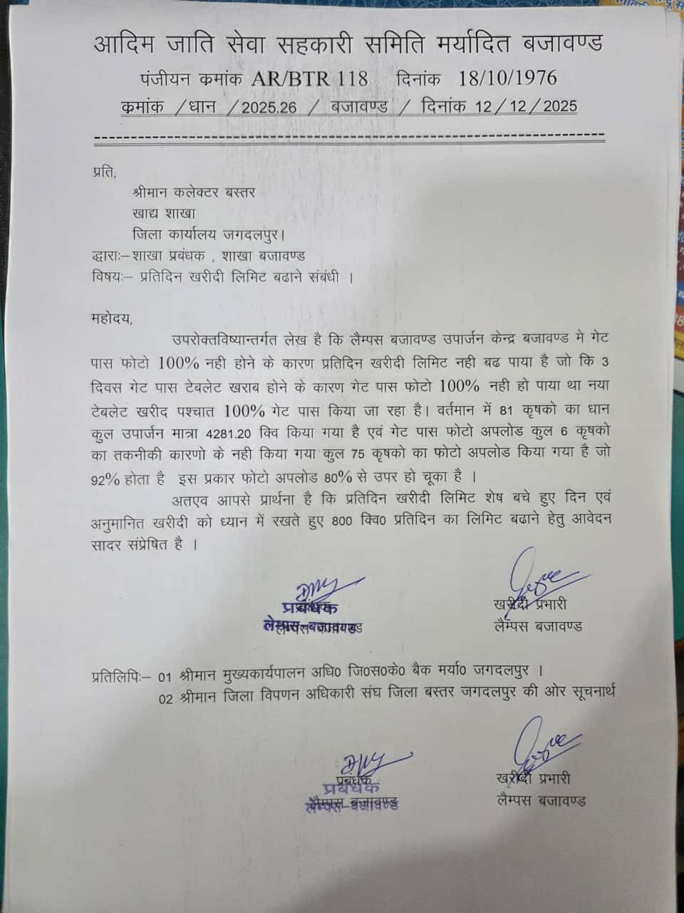 धान खरीदी केंद्र बजावंड में दर्जनों किसानों ने एकजुट होकर विरोध दर्ज कराया। किसानों का कहना है कि अभी फिलहाल 400. 4 क्विंटल लिमिट रखे जाने से किसानों द्वारा गहरी नाराजगी जताई जा रही है। बजावंड केंद्र में 13 नंबर से 15 दिसंबर तक 4682.40 क्विंटल ही धान की खरीदी हुई है, जबकि पिछले वर्ष लगभग 25 हजार क्विंटल धान की खरीदी इसी अवधि में हो चुकी थी। किसानों ने कहा है लिमिट नहीं बढ़ाई गई, तो बजावंड उपार्जन केंद्र को बंद कर यहां से उपार्जित धान का परिवहन भी नहीं होने दिया जाएगा। विरोध करने वाले किसानों में राकेश पाणिग्रही, डोमूराम, राम भारती, तुलसी माली, फालगुनी पटेल, धनीराम पटेल, तुला पटेल, नील सुंदर माली, दिनेश पटेल, मोहन झाली, नारायण बघेल, समेत सैकड़ों किसान उपस्थित थे।