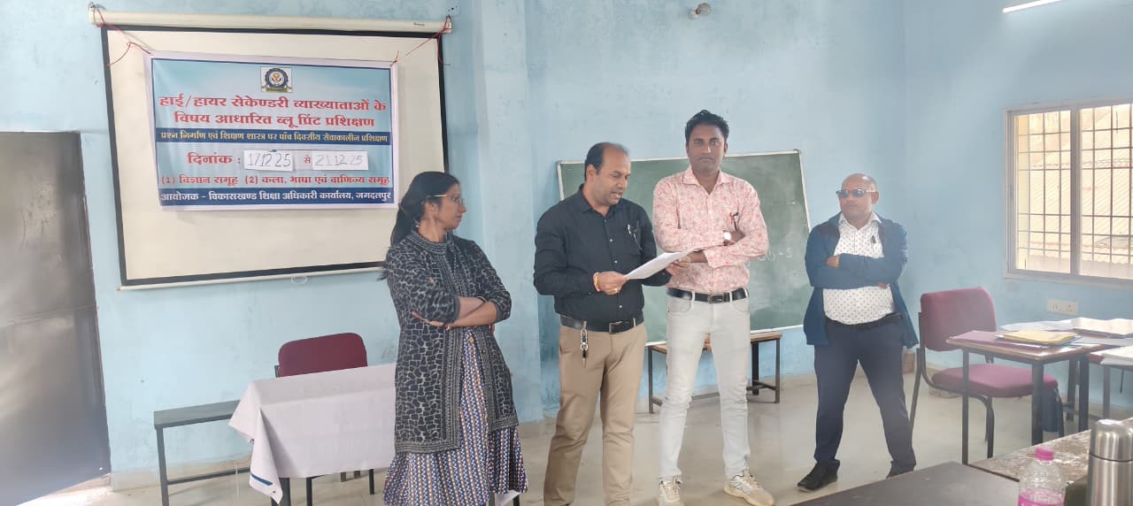 जगदलपुर। हाई एवं हायर सेकंडरी स्कूलों के व्याख्याताओं के लिए विषय आधारित ब्लूप्रिंट, प्रश्न पत्र निर्माण एवं शिक्षण शास्त्र पर केंद्रित पांच दिवसीय सेवाकालीन प्रशिक्षण का आयोजन 17 से 21 दिसंबर तक जगतू माहरा शासकीय उच्चतर माध्यमिक विद्यालय जगदलपुर में किया गया।