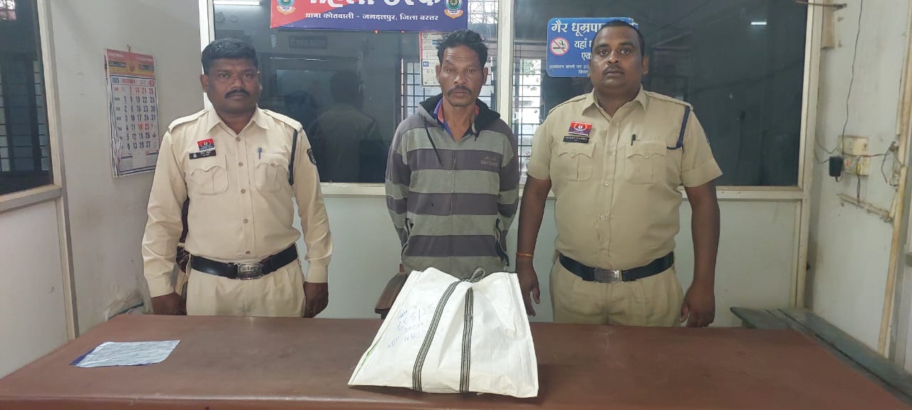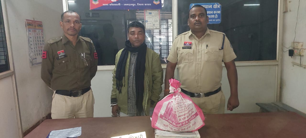 सिटी कोतवाली जगदलपुर को सूचना मिली थी कि केंद्रीय विद्यालय के पास गली में एक व्यक्ति प्लास्टिक थैले में गांजा रख कर बिक्री कर रहा है। एक अन्य मामले में सनसिटी अटल आवास के पास खाली मैदान पर एक अन्य व्यक्ति झोले में गांजा रख कर बिक्री कर रहा है। पुलिस अधीक्षक शलभ कुमार सिन्हा के निर्देश पर अतिरिक्त पुलिस अधीक्षक महेश्वर नाग के मार्गदर्शन एवं नगर पुलिस अधीक्षक सुमीत कुमार के पर्यवेक्षण में थाना प्रभारी सिटी कोतवाली भोला सिंह राजपूत के नेतृत्व में अलग अलग टीमें गठित कर दोनों जगहों के लिए रवाना की गईं। टीमों ने घेराबंदी कर दोनो संदिग्ध व्यक्तियों को पकड़ लिया। एक आरोपी का नाम संजय नाग पिता स्व. तुलाराम नाग उम्र 43 साल जाति धुरवा निवासी हल्बाकचोरा है। उसके कब्जे 1 किलो 530 ग्राम गांजा बरामद किया गया।