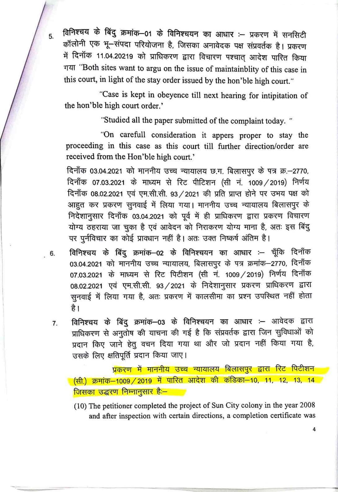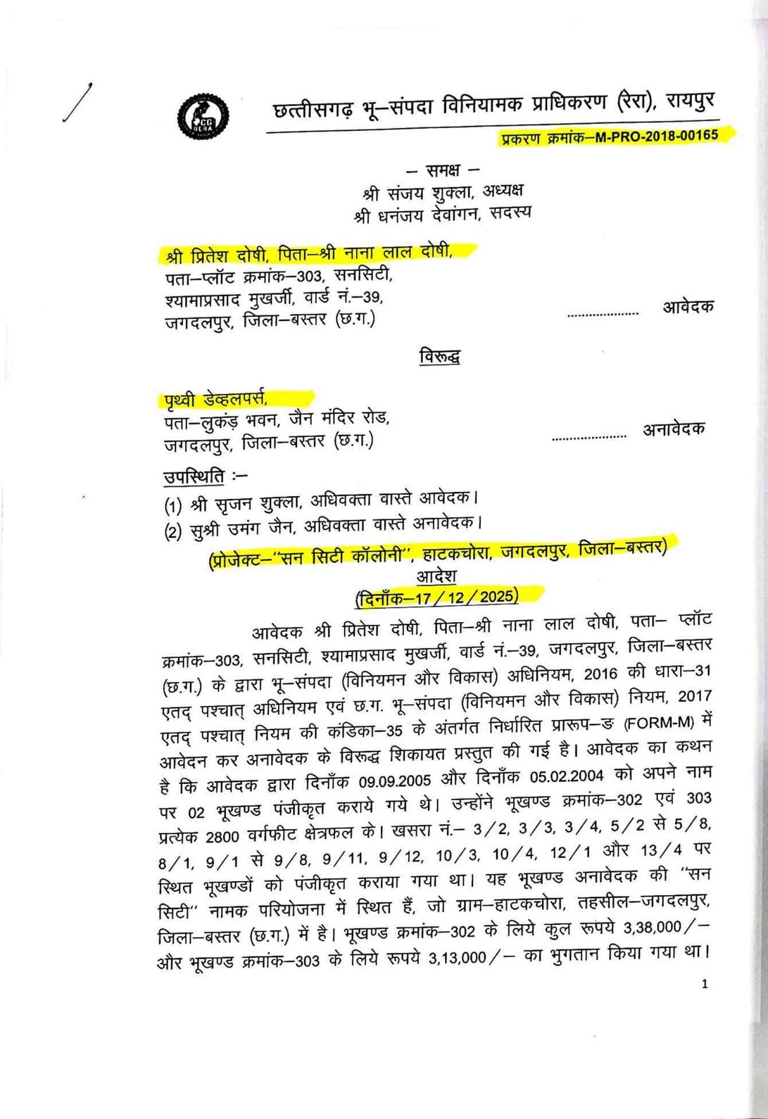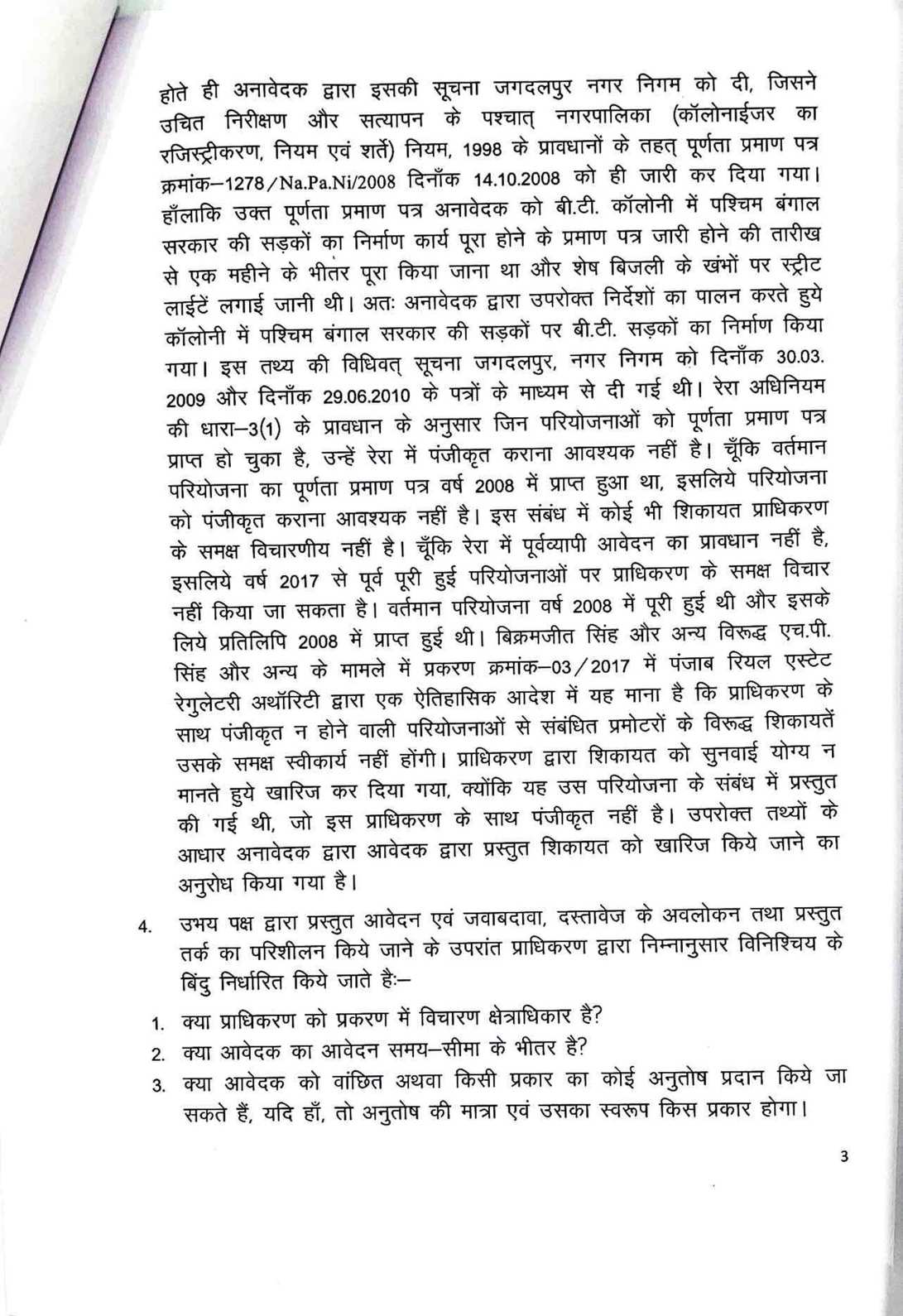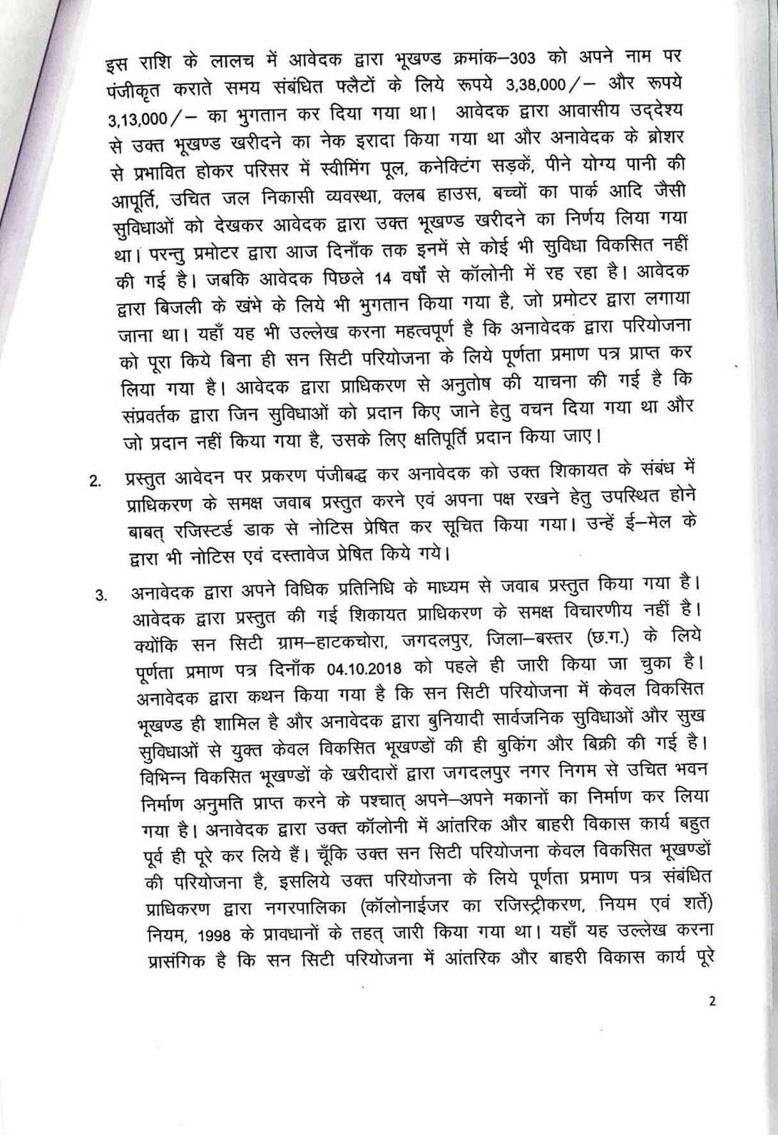 सन सिटी के प्लॉट नंबर 302 और 303 के मालिक और मामले के शिकायतकर्ता प्रीतेश दोषी ने 2018 में रेरा में शिकायत दर्ज कराई थी। उन्होंने आरोप लगाया कि डेवलपर ने ब्रोशर में स्विमिंग पुल, सडक़ें, पानी की आपूर्ति, पार्क जैसी सुविधाओं का वादा किया था, लेकिन 14 साल बाद भी ये सुविधाएं नहीं दी गईं। दोषी ने 2004-2005 में प्लॉट खरीदे थे और कुल 6.51 लाख रुपये का भुगतान किया था। उन्होंने कहा कि डेवलपर ने विकास कार्य पूर्ण किए बिना ही 2008 में नगर निगम से पूर्णता प्रमाण पत्र ले लिया था। जांच रिपोर्ट में पुष्टि हुई कि एक दर्जन से अधिक काम अधूरे हैं। रेरा ने मामले की जांच के लिए कमिश्नर नियुक्त किया, जिसकी रिपोर्ट में पुष्टि हुई कि ड्रेन वर्क), कल्वर्ट पुलिया, सीसी रोड, उद्यान विकास, वृक्षारोपण, जल आपूर्ति नेटवर्क, ब्लैक टॉप रोड और क्लब हाउस का निर्माण अधूरा है। केवल विद्युतीकरण कार्य पूरा हुआ है। अनावेदक पृथ्वी डेवलपर्स ने दावा किया कि परियोजना केवल विकसित प्लॉट्स की है और विकास कार्य 2008 में पूरे हो चुके थे। लेकिन प्राधिकरण ने हाईकोर्ट के 2021 के फैसले का हवाला देते हुए कहा कि परियोजना ऑनगोइंग है, इसलिए रेरा पंजीकरण जरूरी था। हाईकोर्ट ने माना था कि अधूरे कार्यों के कारण पूर्णता प्रमाण पत्र रद्द किया जा सकता है और रेरा के तहत कार्रवाई होनी चाहिए।प्राधिकरण के अध्यक्ष संजय शुक्ला और सदस्य धनंजय देवांगन ने आदेश में कहा है कि डेवलपर को सक्षम प्राधिकारी से मानकों के अनुसार कार्य पूर्ण कर पूर्णता प्रमाण पत्र लेना होगा। शिकायतकर्ता की क्षतिपूर्ति की मांग पर प्राधिकरण ने कहा कि यह न्याय निर्णायक अधिकारी के क्षेत्राधिकार में है, इसलिए उसे अलग से दावा करना होगा।