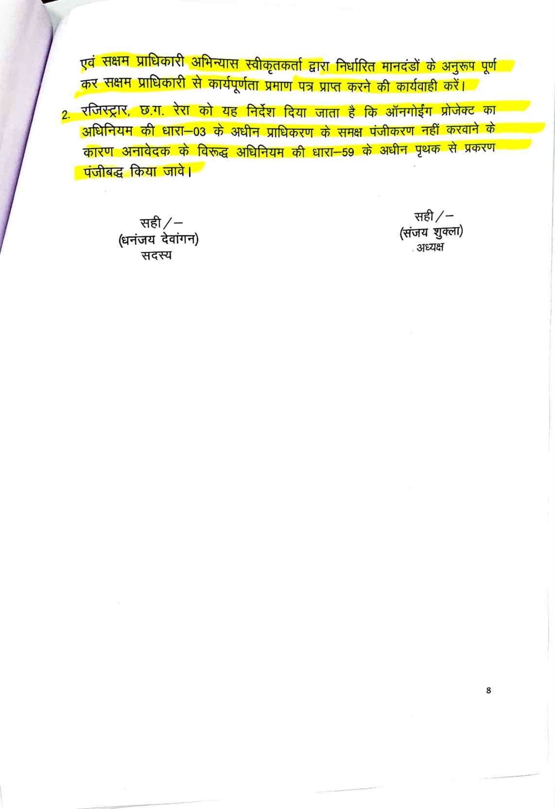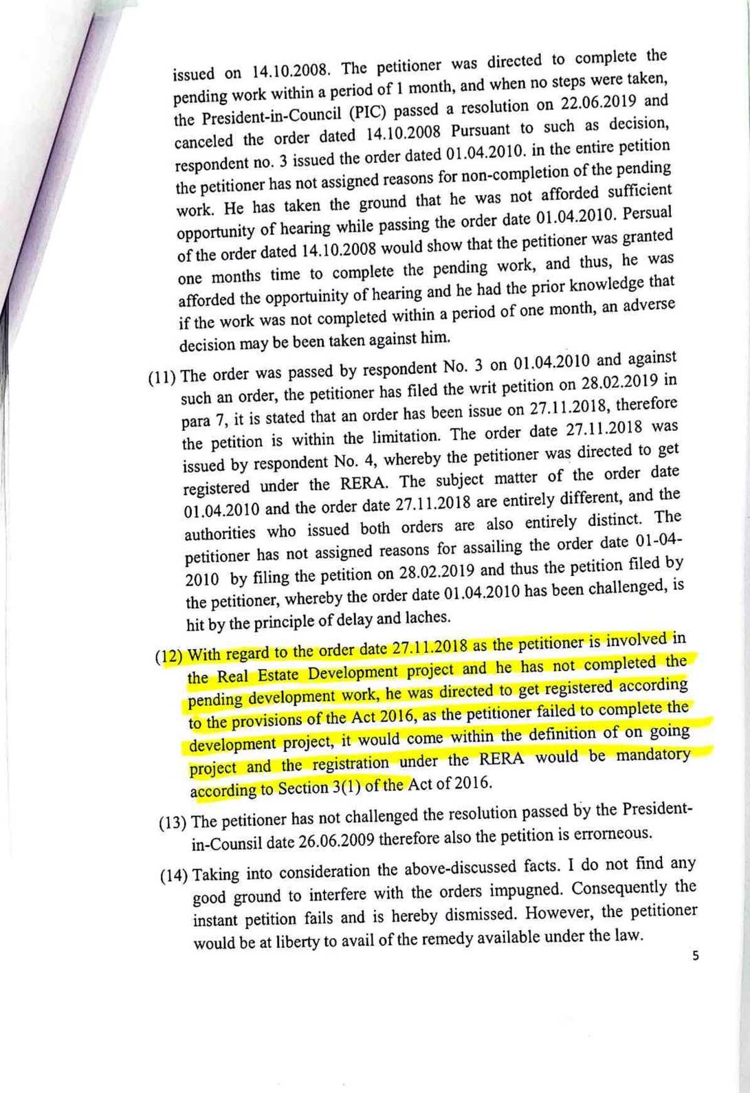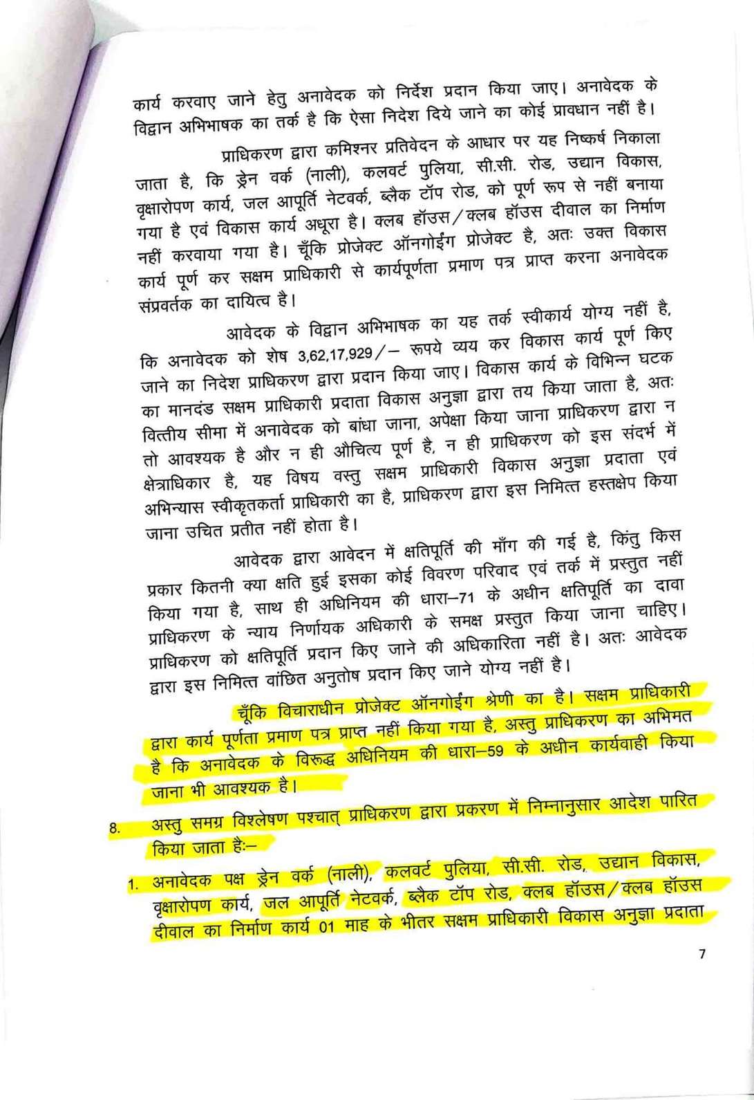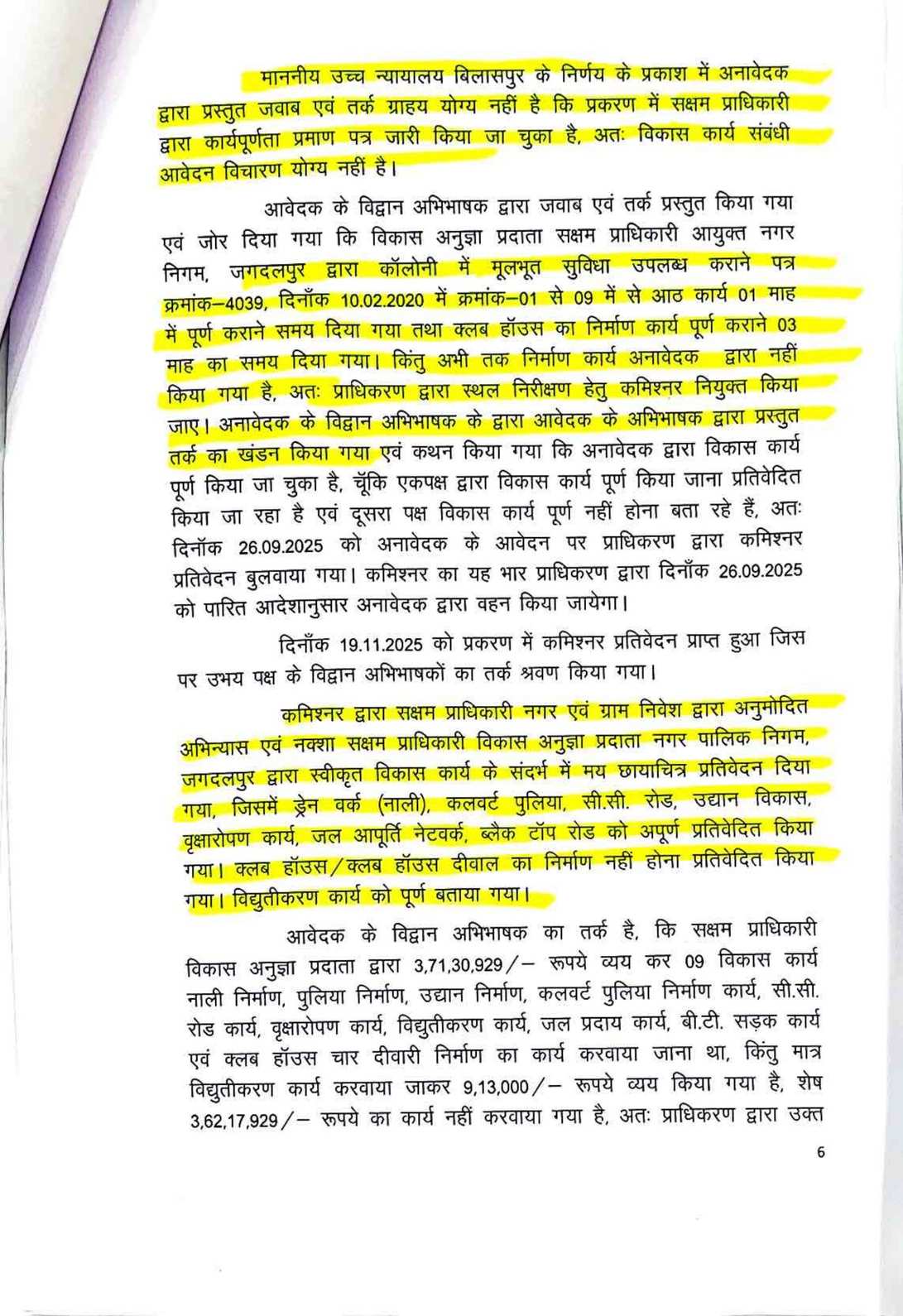 सन सिटी के प्लॉट नंबर 302 और 303 के मालिक और मामले के शिकायतकर्ता प्रीतेश दोषी ने 2018 में रेरा में शिकायत दर्ज कराई थी। उन्होंने आरोप लगाया कि डेवलपर ने ब्रोशर में स्विमिंग पुल, सडक़ें, पानी की आपूर्ति, पार्क जैसी सुविधाओं का वादा किया था, लेकिन 14 साल बाद भी ये सुविधाएं नहीं दी गईं। दोषी ने 2004-2005 में प्लॉट खरीदे थे और कुल 6.51 लाख रुपये का भुगतान किया था। उन्होंने कहा कि डेवलपर ने विकास कार्य पूर्ण किए बिना ही 2008 में नगर निगम से पूर्णता प्रमाण पत्र ले लिया था। जांच रिपोर्ट में पुष्टि हुई कि एक दर्जन से अधिक काम अधूरे हैं। रेरा ने मामले की जांच के लिए कमिश्नर नियुक्त किया, जिसकी रिपोर्ट में पुष्टि हुई कि ड्रेन वर्क), कल्वर्ट पुलिया, सीसी रोड, उद्यान विकास, वृक्षारोपण, जल आपूर्ति नेटवर्क, ब्लैक टॉप रोड और क्लब हाउस का निर्माण अधूरा है। केवल विद्युतीकरण कार्य पूरा हुआ है। अनावेदक पृथ्वी डेवलपर्स ने दावा किया कि परियोजना केवल विकसित प्लॉट्स की है और विकास कार्य 2008 में पूरे हो चुके थे। लेकिन प्राधिकरण ने हाईकोर्ट के 2021 के फैसले का हवाला देते हुए कहा कि परियोजना ऑनगोइंग है, इसलिए रेरा पंजीकरण जरूरी था। हाईकोर्ट ने माना था कि अधूरे कार्यों के कारण पूर्णता प्रमाण पत्र रद्द किया जा सकता है और रेरा के तहत कार्रवाई होनी चाहिए।प्राधिकरण के अध्यक्ष संजय शुक्ला और सदस्य धनंजय देवांगन ने आदेश में कहा है कि डेवलपर को सक्षम प्राधिकारी से मानकों के अनुसार कार्य पूर्ण कर पूर्णता प्रमाण पत्र लेना होगा। शिकायतकर्ता की क्षतिपूर्ति की मांग पर प्राधिकरण ने कहा कि यह न्याय निर्णायक अधिकारी के क्षेत्राधिकार में है, इसलिए उसे अलग से दावा करना होगा।