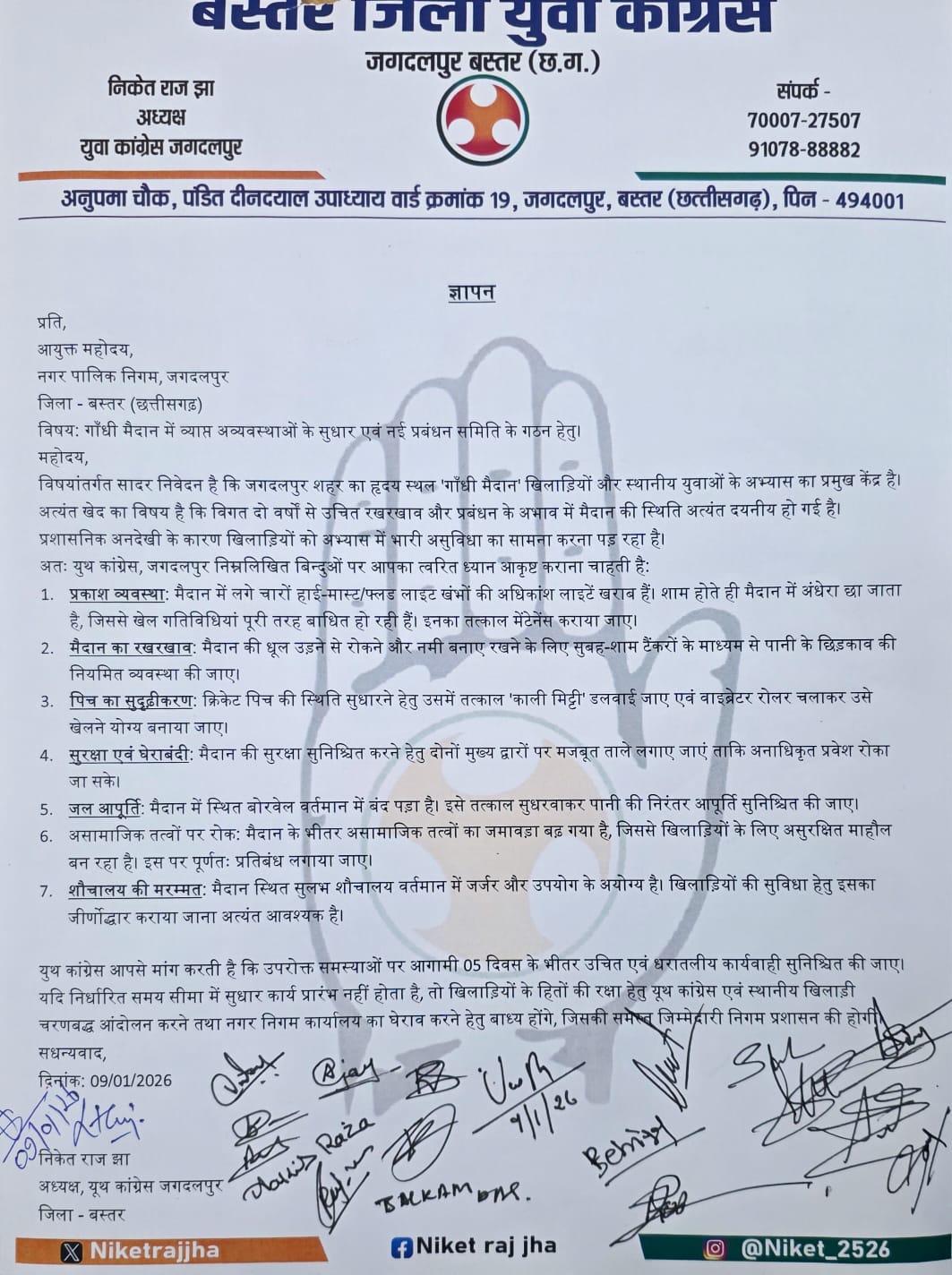 श्री झा ने कहा है कि इन समस्याओं पर आगामी 5 दिवस के भीतर उचित एवं धरातलीय कार्यवाही सुनिश्चित की जाए। यदि निर्धारित समय सीमा में सुधार कार्य प्रारंभ नहीं होता है, तो खिलाड़ियों के हितों की रक्षा हेतु यूथ कांग्रेस एवं स्थानीय खिलाड़ी चरणबद्ध आंदोलन करने तथा नगर निगम कार्यालय का घेराव करने हेतु बाध्य होंगे। इस अवसर पर नेता प्रतिपक्ष राजेश चौधरी, विक्रम सिंह डांगी, पार्षद शुभम यदु, ललिता राव, जिला उपाध्यक्ष सोनारु नाग, आकिब रज़ा, शेख सद्दाम रज़ा, वैभव नेताम, ब्लॉक अध्यक्ष रजत जोशी, आदर्श नायक, प्रभुदास नाग, प्रदीप सेठिया, एनसयूआई प्रदेश महासचिव आदित्य बिसेन महासचिव हेमंत पाण्डेय, उस्मान रज़ा, कृष्णा उपाध्याय, तरणजीत सिंह रंधावा, इंदर झज्ज, सचिव शेख जुनैद, खेमराज सेठिया, अजय पाण्डेय, तरसेम जसवाल, राज, बलराम आदि मौजूद रहे।