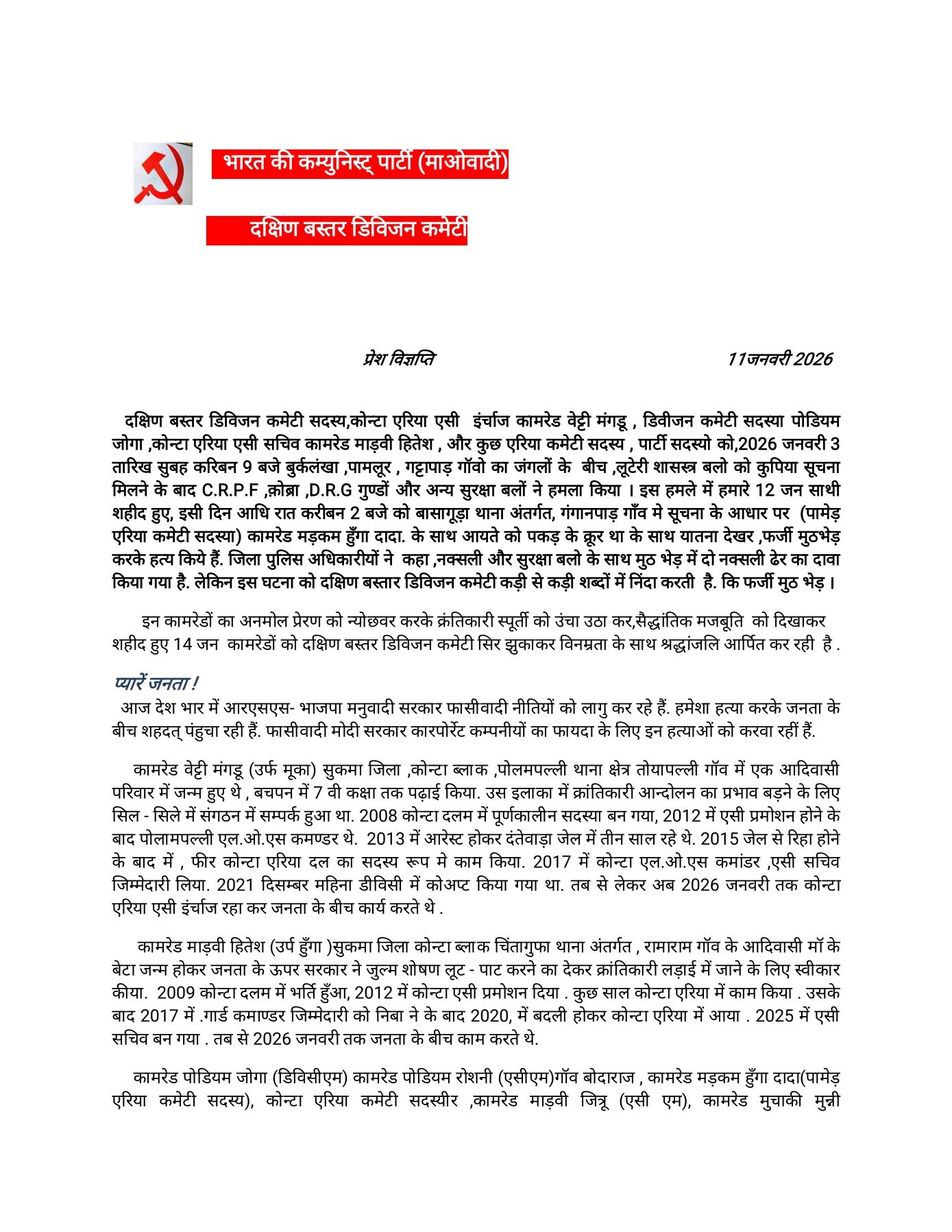 दक्षिण बस्तर डिवीजन कमेटी के प्रवक्ता गंगा द्वारा जारी इस पत्र में सदस्य, कमेटी सदस्य एवं कोंटा एरिया एसी इंचार्ज वेठी मांगू, डिवीजन कमेटी सदस्य पोडियम जोगा, कोंटा एरिया एसी सचिव माईडी हिसरा, और कुछ एरिया कमेटी सदस्यों पर 3 जनवरी को 9 बजे कुरवेलार, ग्रामेर, गुदापाड़ा गांवों के जंगलों में पुलिस, सीआरपीएफ, कोबरा, डीआरजी और अन्य सुरक्षा बलों ने हमला किया। इस हमले में 12 जन साथी शहीद हुए, इसी दिन रात 2 बजे को बारसूर थाना अंतर्गत, गंगालगुड़ा गांव में प्रभारी एरिया कमेटी सदस्य) कामरेड मदकम हिड़मा उर्फ बावा, और कमेटी के एक अन्य कार्यकर्ता को पुलिस बल ने घेर कर हमला करते हुए ढेर किया। जिला पुलिस अधिकारियों ने कहा, नक्सलियों और सुरक्षा बलों के बीच मुठभेड़ हुई और नक्सली ढेर हो गए। लेकिन इस दावे का दक्षिण बस्तर डिवीजन कमेटी खंडन करती है। कोई भी मुठभेड़ नहीं हुई है। आम जनता को संबोधित करते हुए गंगा ने कहा है कि आज हमारे भारत में आरएसएस, भाजपा मनुवादी सरकार जनविरोधी कानून को लागू कर रही है। आज तक जनता आंदोलन चलाकर सरकारों को सत्ता से बाहर करती रही है। आरएसएस, भाजपा मनुवादी देश के समृद्ध और प्राकृतिक संसाधन को विकास के नाम पर कंपनियों को सौंपा रहे हैं। इसके खिलाफ जन आंदोलन उभर रहा है। हम क्रांतिकारी के रूप में लड़ रहे हैं और कुर्बान दे रहे हैं। सरकार जनता को गुमराह कर रही है। हम मनुवादी व्यवस्था को खत्म करने की योजना पर काम कर रहे हैं। हम क्रांतिकारी आंदोलन कर रहे हैं। जब तक गरीब शोषित और शोषक वर्ग है तब तक हम आंदोलन जारी रखेंगे। जनता का मनुवादी व्यवस्था का विरोध करे और क्रांतिकारी मानववादी समाज का समर्थन न करने के लिए आगे आए।
