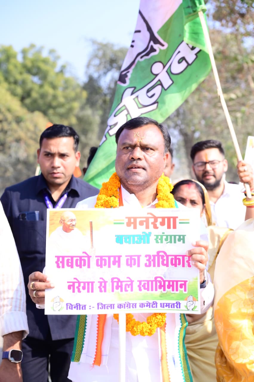 रायपुर। मनरेगा बचाओ संग्राम के तहत कांग्रेस ने प्रदेश कांग्रेस अध्यक्ष दीपक बैज के नेतृत्व में धमतरी के ग्राम मेघा से अरौद, गिरौद, सौंगा, हरदी में आयोजित ग्राम पंचायत स्तरीय पदयात्रा का आयोजन किया गया। कांग्रेस मनरेगा संशोधन के खिलाफ पूरे देश में मनरेगा बचाओ संग्राम चला रही है, जिसके तहत छत्तीसगढ़ में भी विभिन्न कार्यक्रम चलाये जा रहे है। इसी आंदोलन के तहत प्रदेश में जनसंपर्क पदयात्राये पंचायत क्षेत्रो में निकाली जा रही है। प्रदेश कांग्रेस अध्यक्ष दीपक बैज इसके पहले राजधानी के रायपुर में तथा राजनांदगांव एवं बस्तर, बेमेतरा, महासमुंद, कोरबा, गौरेला – पेण्ड्रा- मरवाही सहित प्रदेश के अनेक हिस्सों में मनरेगा बचाओं पदयात्रा निकल चुकी है।