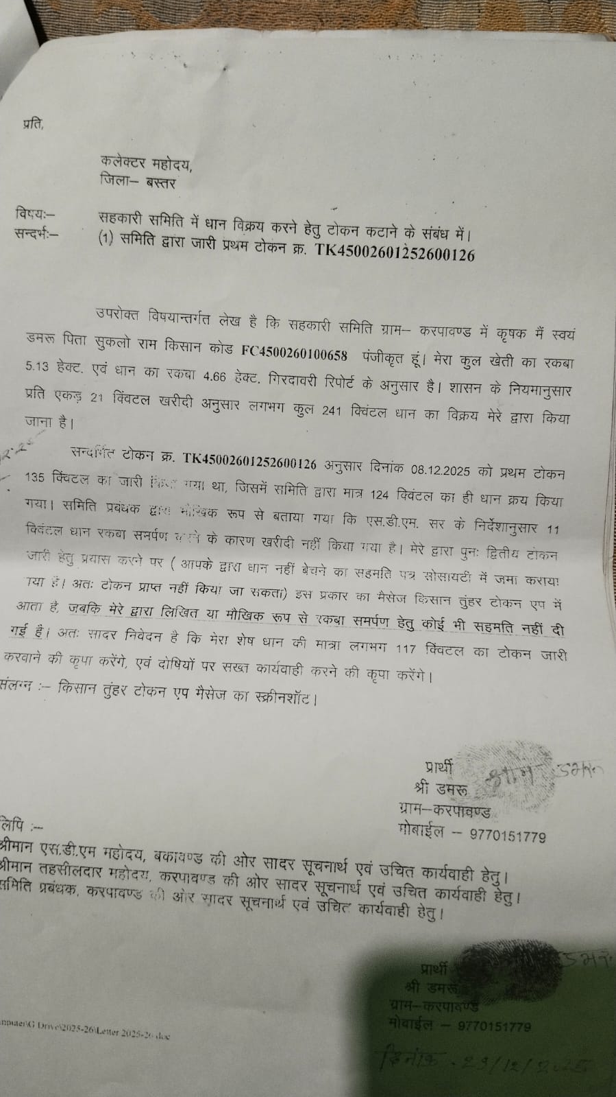 बकावंड विकासखंड में धान खरीदी में भारी अव्यवस्था हावी रही।किसान विभागीय अधिकारियों पर गंभीर आरोप लगा रहे हैं। सोसायटी मैनेजर और पटवारी की लापरवाही से किसान बेहद परेशान हैं। कई किसानों ने बस्तर विधायक, कलेक्टर एवं एसडीएम से न्याय की गुहार लगाई है विकासखंड के करपावंड धान खरीदी केंद्र में किसानों को जमकर छला गया है। किसानों का आरोप है कि भौतिक सत्यापन पूर्ण हो जाने के बावजूद भी उनकी सहमति के बिना धान की बिक्री नहीं हो पाई जिससे वे आर्थिक और मानसिक परेशानी का सामना कर रहे हैं। किसानों का कहना है कि शासन द्वारा समस्या के समाधान के लिए दो दिन का समय विभागीय अधिकारियों को दिया गया था, लेकिन जमीनी स्तर पर हालात जस के तस बने हुए हैं। कई किसानों ने आरोप लगाया कि जानबूझकर कम मात्रा का टोकन काटा गया है, जिससे वे अपना पूरा धान एकसाथ नहीं बेच पाए। धान बेचने पहुंचे किसानों ने बताया कि उन्होंने पूरी प्रक्रिया के तहत पंजीयन कराया, भौतिक सत्यापन भी कराया गया। सीमांत किसानों के लिए यह स्थिति और भी गंभीर हो गई है, क्योंकि उन्हें परिवहन, मजदूरी और समय का अतिरिक्त बोझ उठाना पड़ रहा है। किसानों ने विभागीय अधिकारियों पर लापरवाही और मनमानी के करने का आरोप लगाए हैं। उनका कहना है कि शिकायत करने के बावजूद कोई ठोस कार्रवाई नहीं की जा रही है। कुछ किसानों ने यह भी आरोप लगाया कि बिचौलियों को फायदा पहुंचाने के लिए जानबूझकर किसानों को परेशान किया गया है।किसानों ने शासन से मांग की है कि धान खरीदी प्रक्रिया में पारदर्शिता लाई जाए और किसानों का कहना है कि बत्तीस किसानों का भौतिक सत्यापन पूरा होने के बाद भी चार किसान ही अपना धान बेच पाए हैं। शेष 28 किसान धान बेचने से वंचित रह गए। किसानों ने गलत जानकारी भेजने वाले पटवारी और कम मात्रा का टोकन काटने वाले सोसायटी मैनेजर पर सख्त कार्रवाई की मांग की है।