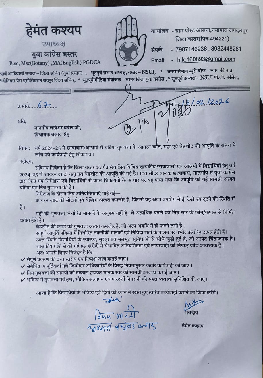 जगदलपुर। बस्तर जिला युवा कांग्रेस के उपाध्यक्ष हेमंत कश्यप ने बस्तर जिले में संचालित शासकीय छात्रावासों एवं आश्रमों में विद्यार्थियों को उपलब्ध कराई जा रही मूलभूत सुविधाओं में भारी अनियमितता का गंभीर मामला सामने लाया है। वर्ष 2024–25 में छात्रावास/आश्रमों में सप्लाई किए गए आयरन पलंग, गद्दों एवं बेडशीट की गुणवत्ता अत्यंत घटिया पाई गई है। युवा कांग्रेस जिला उपाध्यक्ष हेमंत कश्यप के नेतृत्व में युवा कांग्रेस कार्यकर्ताओं द्वारा 100 सीटर बालक छात्रावास, मालगांव का निरीक्षण किया गया। निरीक्षण के दौरान विद्यार्थियों ने खराब गुणवत्ता की सामग्री को लेकर गंभीर शिकायतें दर्ज कराई। निरीक्षण में यह पाया गया कि आयरन खाट की वेल्डिंग एवं मोटाई अत्यंत कमजोर है, जो अल्प उपयोग में ही टेढ़ी होकर टूटने की स्थिति में है। वहीं गद्दे अत्यधिक पतले एवं निम्न स्तर के फोम व कपास से निर्मित हैं तथा बेडशीट की गुणवत्ता इतनी खराब है कि वे कुछ ही दिनों में फटने लगी हैं। इस गंभीर विषय को लेकर युवा कांग्रेस द्वारा बस्तर विधायक लखेश्वर बघेल एवं जिला कलेक्टर आकाश छिकारा को शिकायती ज्ञापन सौंपते हुए निष्पक्ष एवं उच्च स्तरीय जांच की मांग की गई है। ज्ञापन में दोषी आपूर्तिकर्ताओं एवं जिम्मेदार अधिकारियों के विरुद्ध कड़ी कार्रवाई करने तथा विद्यार्थियों को तत्काल मानक गुणवत्ता की सामग्री उपलब्ध कराने की मांग की गई है।