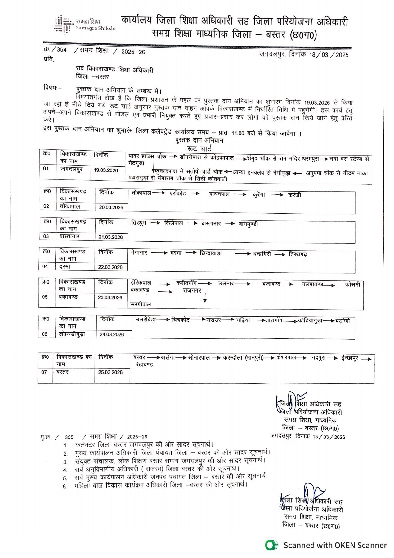कलेक्टर आकाश छिकारा के इस महति अभियान को धरातल पर साकार करने के लिए बस्तर के जिला शिक्षा अधिकारी बीआर बघेल ने कमर कस ली है। उन्होंने बताया कि पुस्तक दान हेतु विशेष रथ जिले के समस्त विकास खंडों में तिथिवार पहुंचेगा। इसके लिए सभी विकासखंड शिक्षा अधिकारियों और प्राचार्यों को भी अलर्ट कर दिया गया है। जिला शिक्षा अधिकारी श्री बघेल ने पुस्तक रथ का रूट चार्ट सभी बीईओ को प्रेषित कर इस महाअभियान से जुड़ने एवं प्रबुद्ध नागरिकों को जोड़ने के लिए कहा है। रूट चार्ट के मुताबिक पुस्तक रथ आज 20 मार्च को तोकापाल ब्लॉक के तोकापाल, एर्राकोट, बाघनपाल, कुरेंगा व करंजी, 21 मार्च को बास्तानार ब्लॉक के तीरथुम, किलेपाल, बास्तानार व बाघमुंडी, 22 मार्च को दरभा विकासखंड के नेगानार, दरभा, छिंदावाड़ा, चंद्रगिरी व तीरथगढ़, 23 मार्च को बकावंड ब्लॉक के इरिकपाल, करितगांव, उलनार, बजावंड, नलपावंड, कोसमी, बकावंड, राजनगर एवं सरगीपाल, 24 मार्च को लोहंडीगुड़ा ब्लॉक के उसरीबेड़ा, चित्रकोट, धाराऊर, गढ़िया, तारागांव, कोठियागुड़ा व बड़ांजी तथा 25 मार्च को बस्तर विकासखंड के बस्तर, बालेंगा, सोनारपाल, करंदोला भानपुरी, केशरपाल, नंदपुरा, इच्छापुर एवं रेटावंड पहुंचेगा। संग्रहित किताबों को जिला ग्रंथालय एवं विकासखंडों में स्थित गग्रंथालयों में संरक्षित कर, ज्ञान अर्जित करने वाले पाठकों, विद्यार्थियों तक इन पुस्तकों को पहुंचाया जाएगा। जन सहयोग से इन विद्यार्थियों तक यह पुस्तकें पहुंच पाएंगी और इनका लाभ विद्यार्थियों को प्राप्त होगा।