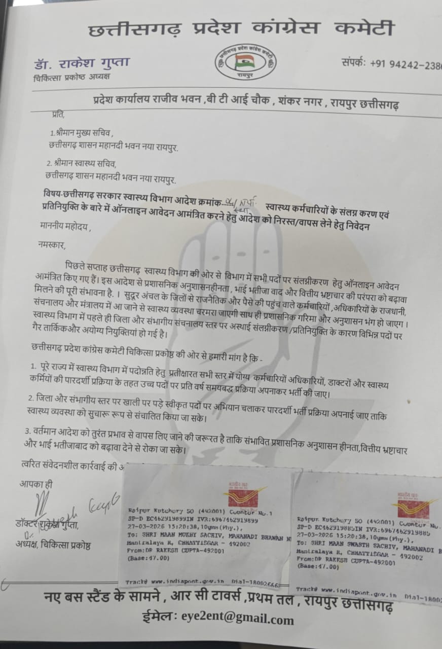 छत्तीसगढ़ प्रदेश कांग्रेस कमेटी चिकित्सा प्रकोष्ठ के प्रदेश अध्यक्ष डॉ राकेश गुप्ता ने राज्य के मुख्य सचिव श्री विकासशील एवं स्वास्थ्य सचिव अमित कटारिया को एक मेल भेज कर इस प्रक्रिया के अंतर्गत स्वास्थ्य विभाग में जिला स्तर से प्रतिनियुक्ति हेतु ऑनलाइन आवेदन मांगे जाने को प्रक्रिया को तुरंत स्थगित करने की मांग की।