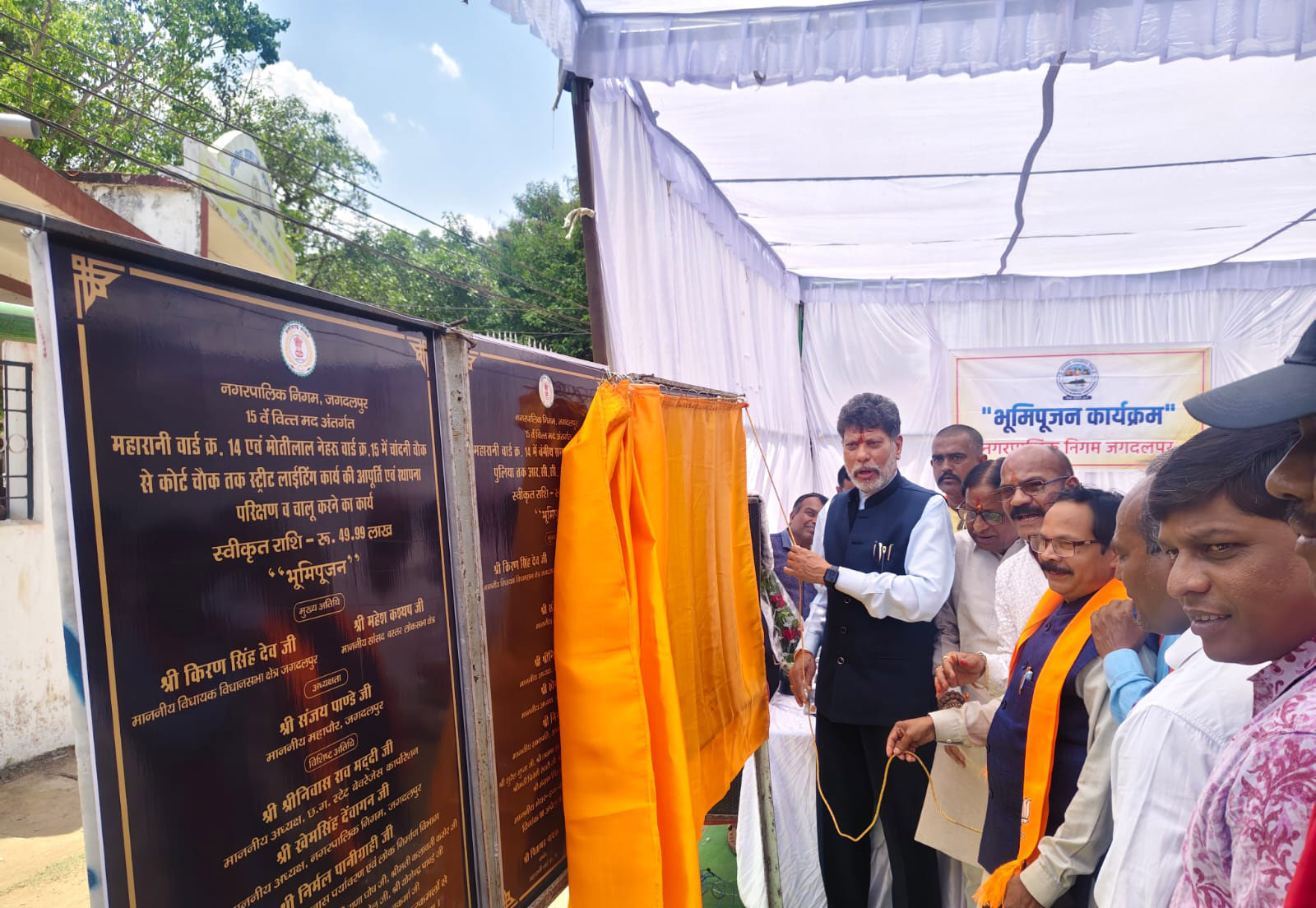 श्री देव ने कहा 15वें वित्त मद से शहर में विभिन्न विकास कार्यों की आधारशिला रखी गई है। यह महज निर्माण कार्य नहीं, बल्कि प्रगति के रास्ते हैं। शहर को जलभराव से निजात दिलाने लगातार कार्य कर पुलिया निर्माण व नाला निर्माण किया जा रहा है। जनता की मांग के अनुरूप विकास कार्य हो रहे हैं। जनता को मूलभूत सुविधाएं देना हमारा दायित्व है जिसके लिए हम लगातार प्रयासरत हैं। सभी निर्माण कार्यों को प्राथमिकता के साथ पूरा किया जा रहा । हमारा लक्ष्य है कि जगदलपुर शहर का कोई भी क्षेत्र का विकास से अछूता न रहे। मुख्यमंत्री विष्णु देव साय एवं उप मुख्यमंत्री अरुण साव के नेतृत्व में विकास कार्य अनवरत जारी रहेगा। विकास कार्य में राशि की कमी नहीं होगी। शहर में लगातार चहुमुखी विकास कार्य हो रहे हैं। वहीं नगर निगम अध्यक्ष खेमसिंह देवांगन ने कहा कि शहर में लगातार विकास कार्य तेज गति के साथ हो रहे हैं। जनता की मांग के अनुरूप विकास कार्य हो रहे हैं। आज जिन निर्माण कार्यों का भूमिपूजन किया गया उनकी मांग क्षेत्र की जनता द्वारा लगातार की जा रही थी। भाजपा प्रदेश अध्यक्ष एवं विधायक किरण देव के नेतृत्व में शहर में जनता की मांग के अनुरूप लगातार विकास कार्य हो रहे हैं। शहर की बहुप्रतीक्षित मांगों को पूरा करने का कार्य किया जा रहा है। इस दौरान निगम अध्यक्ष खेमसिंह देवांगन, एमआईसी सदस्य निर्मल पाणिग्रही, सुरेश गुप्ता, योगेंद्र पांडे, संजय विश्वकर्मा, लक्ष्मण झा, त्रिवेणी रंधारी, पार्षद पितामह नायक, आलोक अवस्थी, नरसिंह राव, पूनम सिन्हा, राधिका यादव, बंसती समरथ, आशा साहू, महामंत्री परेश बसेरा, मंडल अध्यक्ष अविनाश श्रीवास्तव, युवा मोर्चा अध्यक्ष अभिलाष यादव, राजपाल कसेर, रोशन झा, आशुतोष पाल, नगर निगम आयुक्त प्रवीण कुमार वर्मा, कार्यपालन अभियंता गोपाल भारद्वाज एवं उप अभियंता के अलावा वार्डवासी, भाजपा पदाधिकारी एवं कार्यकर्ता उपस्थित थे।