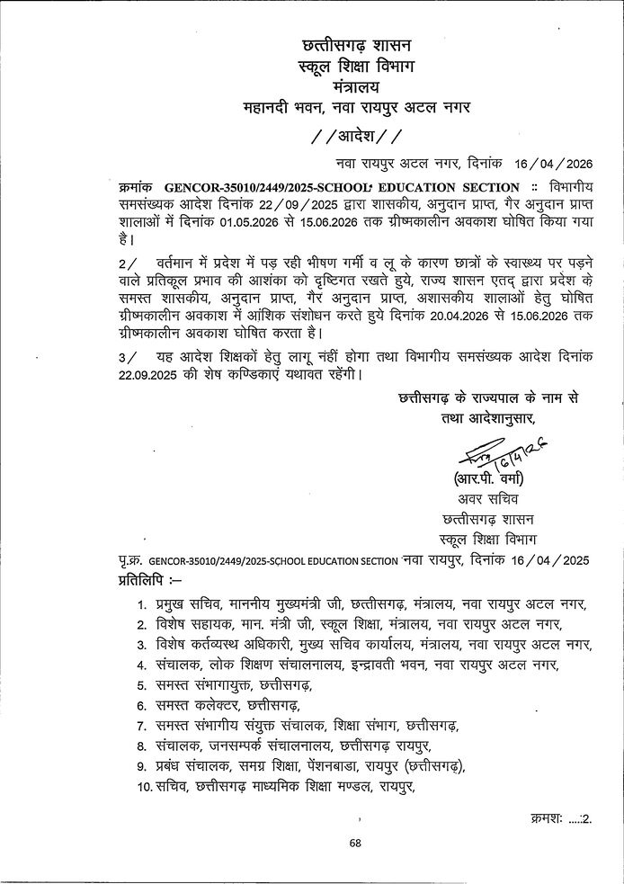 स्कूल शिक्षा विभाग मंत्रालय, महानदी भवन, नवा रायपुर अटल नगर द्वारा जारी आदेश के अनुसार, पूर्व में दिनांक 01 मई 2026 से 15 जून 2026 तक घोषित ग्रीष्मकालीन अवकाश में संशोधन करते हुए अब दिनांक 20 अप्रैल 2026 से 15 जून 2026 तक अवकाश घोषित किया गया है। यह आदेश प्रदेश के समस्त शासकीय, अनुदान प्राप्त, गैर अनुदान प्राप्त एवं अशासकीय शालाओं पर लागू होगा।