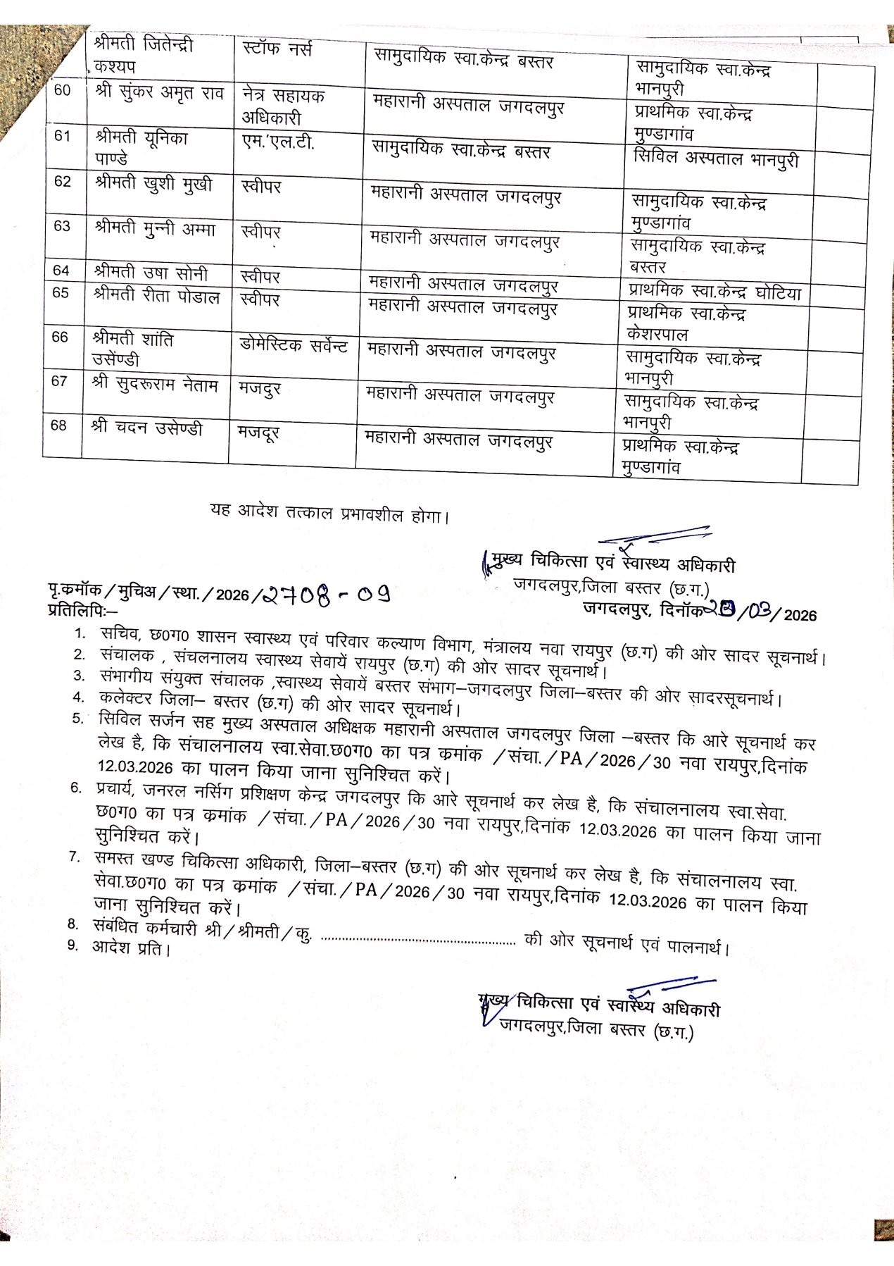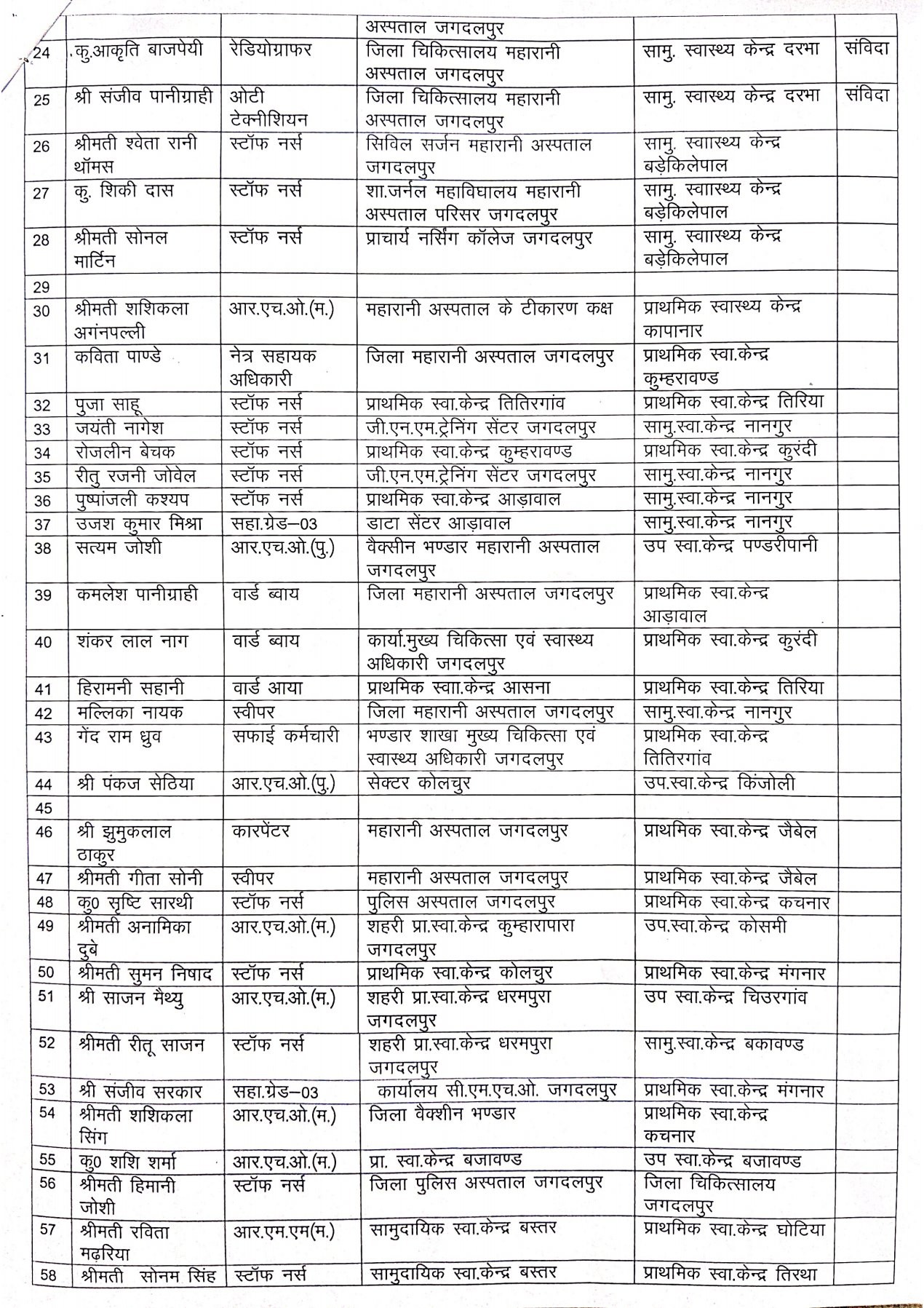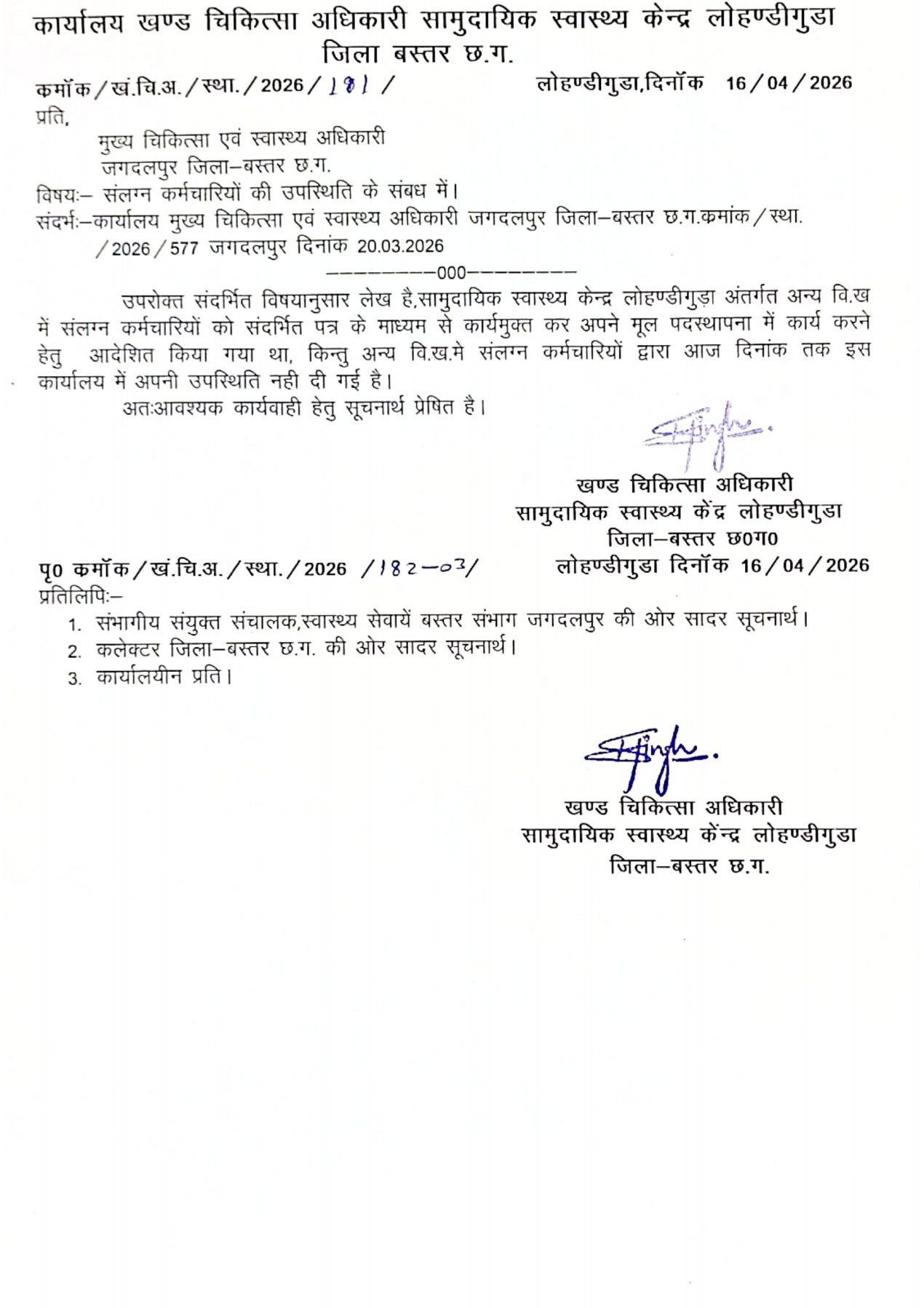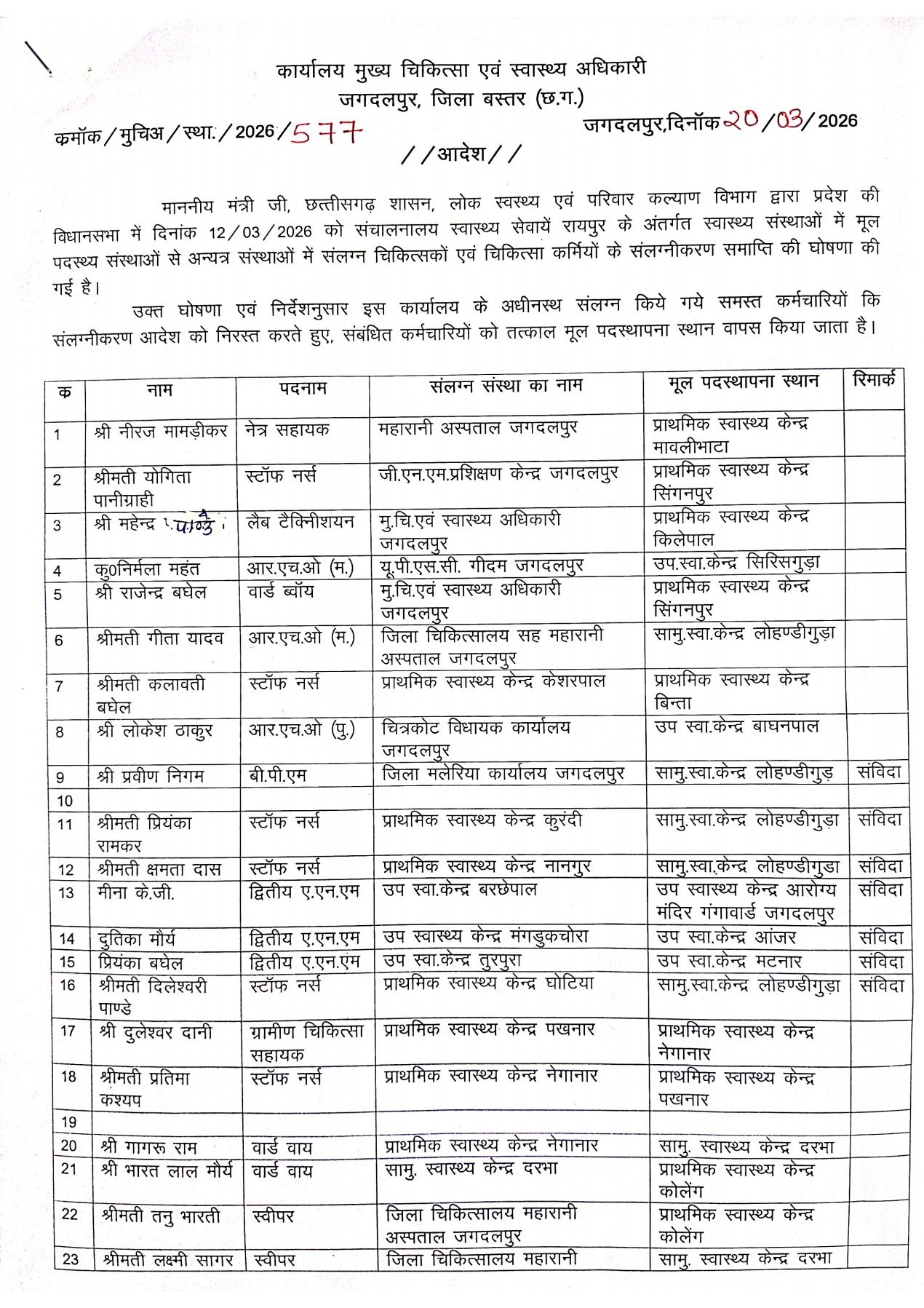 जगदलपुर। शासन द्वारा संलग्नीकरण समाप्त करने के बाद अब उन कर्मचारियों, जो अपने मूल पदास्थापना वाली जगह को छोड़ अन्य जगह संलग्न है उन्हें उनकी मूल जगह पर वापस भेजने की कवायद बस्तर जिले में शुरू हो गई है। लोहंडीगुड़ा सामुदायिक स्वास्थ्य केंद्र के बीएमओ ने भी कई कर्मचारियों को उनकी पुरानी जगह में तत्काल ज्वाइनिंग के लिए कहा है।