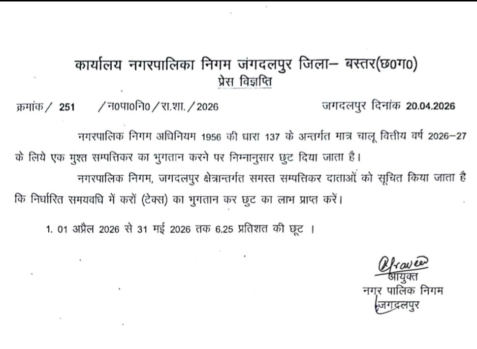 जगदलपुर। नगर पालिक निगम द्वारा नागरिकों को राहत प्रदान करते हुए चालू वित्तीय वर्ष 2026–27 के लिए संपत्तिकर के एकमुश्त भुगतान पर विशेष छूट की घोषणा की गई है। यह निर्णय नगर पालिक निगम अधिनियम 1956 की धारा 137 के अंतर्गत लिया गया है। निगम प्रशासन ने क्षेत्र के समस्त संपत्तिकर दाताओं से अपील की है कि वे निर्धारित समयावधि के भीतर अपने कर का भुगतान कर इस छूट का अधिकतम लाभ उठाएं। घोषणा के अनुसार 1 अप्रैल से 31 मई 2026 तक संपत्तिकर के एकमुश्त भुगतान पर 6.25 प्रतिशत की छूट प्रदान की जाएगी। नगर निगम ने नागरिकों से समय पर कर जमा कर नगर विकास में सहभागिता निभाने की भी अपील की है।