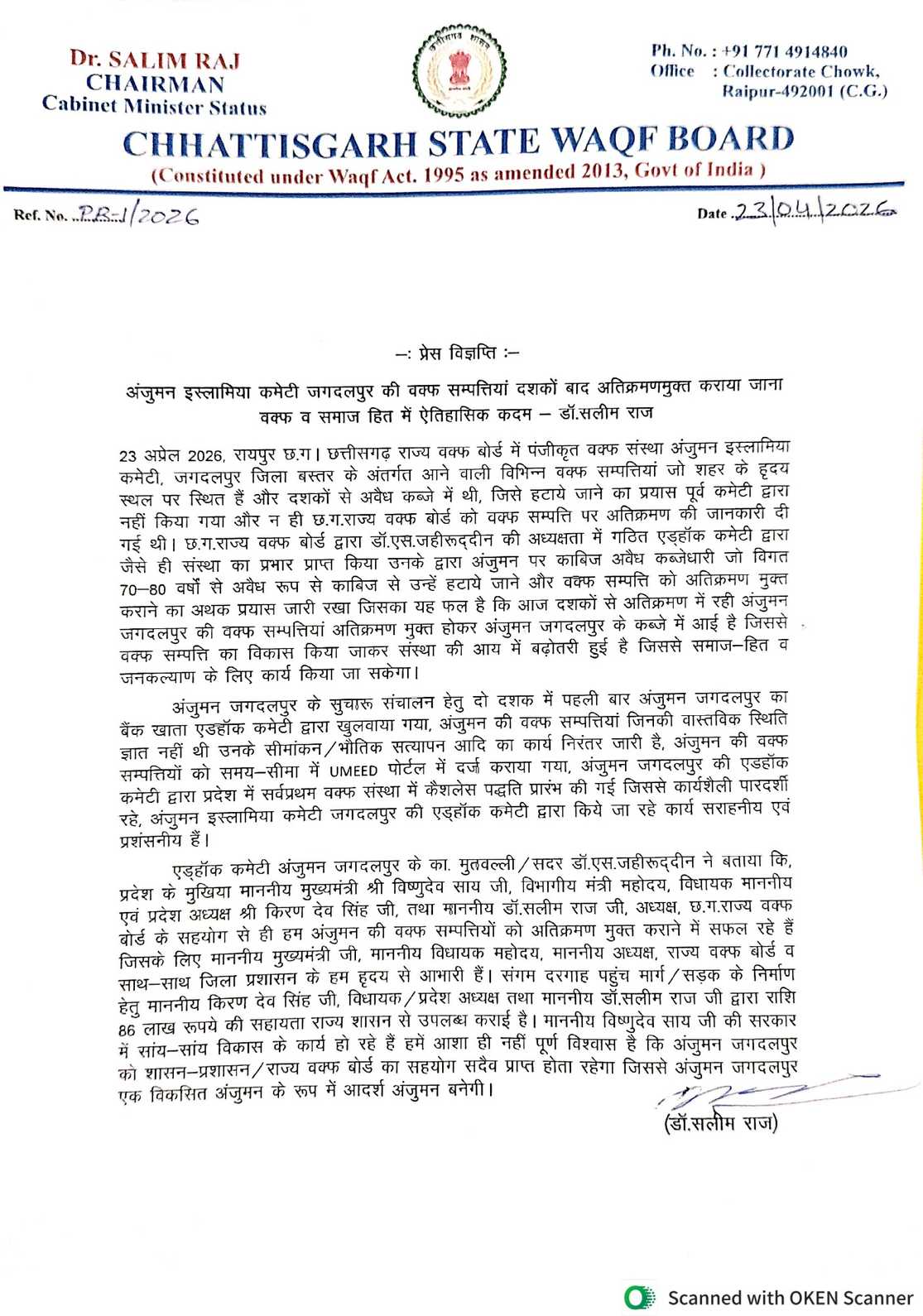 एड्हाॅक कमेटी अंजुमन जगदलपुर के का. मुतवल्ली एवं सदर डाॅ. एस. जहीरूद्दीन ने बताया कि, प्रदेश के मुख्यमंत्री विष्णुदेव साय, विभागीय मंत्री, विधायक एवं प्रदेश भाजपा अध्यक्ष किरण सिंह देव तथा डाॅ. सलीम राज, अध्यक्ष, छग राज्य वक्फ बोर्ड के सहयोग से ही हम अंजुमन की वक्फ सम्पत्तियों को अतिक्रमण मुक्त कराने में सफल हो सके हैं। डॉ. एस जहीरूद्दीन ने मुख्यमंत्री, विधायक, अध्यक्ष राज्य वक्फ बोर्ड व जिला प्रशासन के प्रति आभार व्यक्त किया है। डॉ. जहीरूद्दीन ने बताया कि संगम दरगाह पहुंच मार्ग के निर्माण हेतु विधायक किरण सिंह देव, तथा छग वक्फ बोर्ड अध्यक्ष डाॅ.सलीम राज द्वारा राशि 86 लाख रूपये की सहायता राज्य शासन से उपलब्ध कराई गई है। उन्होंने कहा कि विष्णुदेव साय की सरकार में सांय-सांय विकास के कार्य हो रहे हैं हमें आशा ही नहीं पूर्ण विश्वास है कि अंजुमन जगदलपुर को शासन, प्रशासन, राज्य वक्फ बोर्ड का सहयोग सदैव प्राप्त होता रहेगा जिससे अंजुमन जगदलपुर एक विकसित अंजुमन के रूप में आदर्श अंजुमन बनेगी।