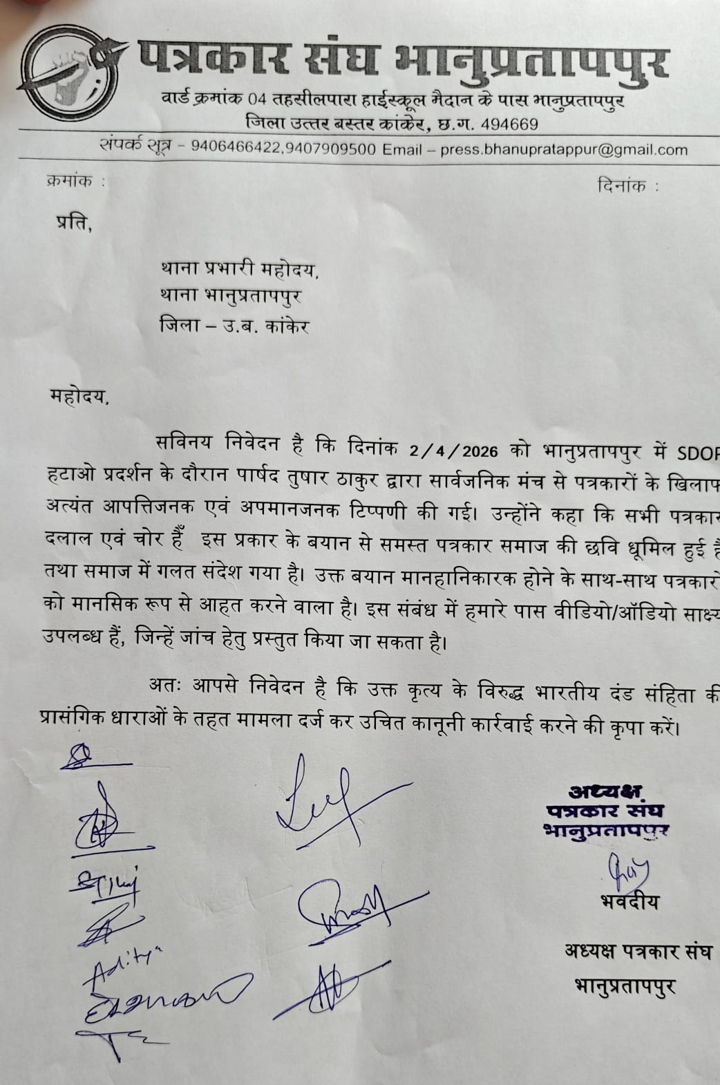 भानुप्रतापपुर। नगर पंचायत के भानुप्रतापपुर के पार्षद तुषार ठाकुर द्वारा पत्रकारों के खिलाफ की गई आपत्तिजनक टिप्पणी को लेकर पत्रकार संघ भानुप्रतापपुर में भारी आक्रोश देखने को मिल रहा है। संघ ने इस बयान को न केवल निंदनीय करार दिया है बल्कि पत्रकारिता की गरिमा पर सीधा हमला भी बताया है। बताया गया है कि 2 अप्रैल को आयोजित एसडीओपी हटाओ प्रदर्शन के दौरान पार्षद तुषार ठाकुर ने सार्वजनिक मंच से पत्रकारों को “दलाल एवं चोर” कहकर संबोधित किया। इस टिप्पणी के सामने आते ही पत्रकारों में गहरा रोष फैल गया और इसे समाज में मीडिया की छवि को धूमिल करने वाला कृत्य बताया गया।